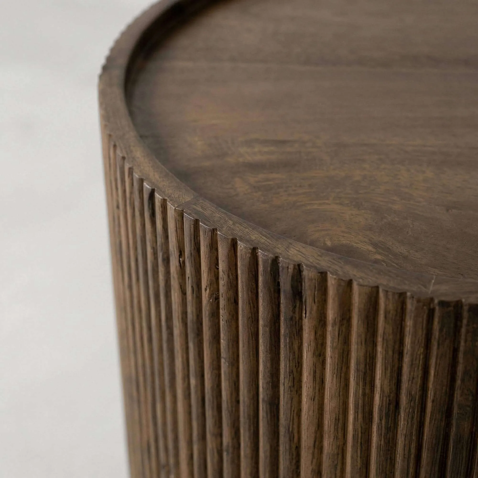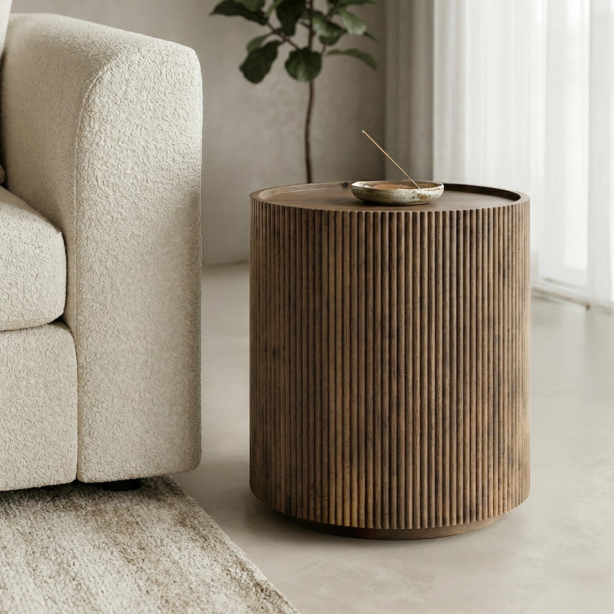 We kozen voor massief mangohout omwille van de rijkdom van de nerven en de diepte van de warme tint. Elk stuk toont unieke nuances die het levendige karakter van het materiaal onderstrepen. Het zorgvuldige werk van de verticale lijnen die het onderstel van deze ronde bijzettafel in massief hout bekleden, benadrukt het ambachtelijke karakter van het Sepia-duo tafels. Deze subtiel ritmische textuur vangt het licht op en laat de tastbaarheid van het hout mooi uitkomen, waardoor een discreet visueel spel ontstaat dat de aandacht trekt zonder ooit het geheel te overheersen.