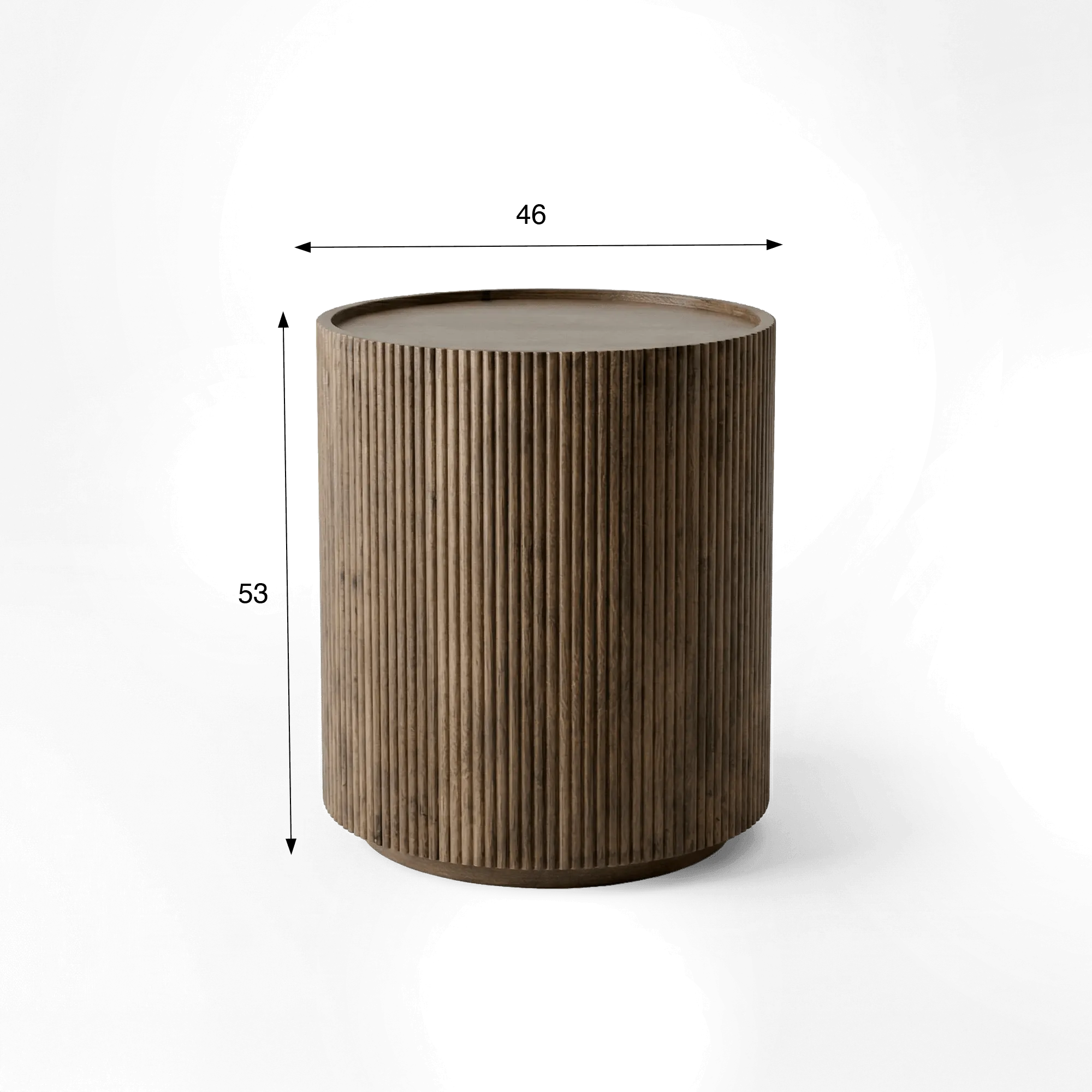 Met de ronde bijzettafel Sepia in massief hout hebben we een meubel ontworpen dat het dagelijkse leven begeleidt en tegelijk een subtiele aanwezigheid toevoegt aan de leefruimte. Het cilindrische silhouet, met evenwichtige verhoudingen (Ø 46 cm, hoogte 53 cm), past zich moeiteloos aan naast een zetel of een fauteuil en biedt een praktisch oppervlak zonder de ruimte te belasten. Dankzij het compacte formaat van deze ronde bijzettafel in massief hout blijven een boek, een tas of een decoratief object altijd binnen handbereik, terwijl het gevoel van een vloeiende, open ruimte behouden blijft.