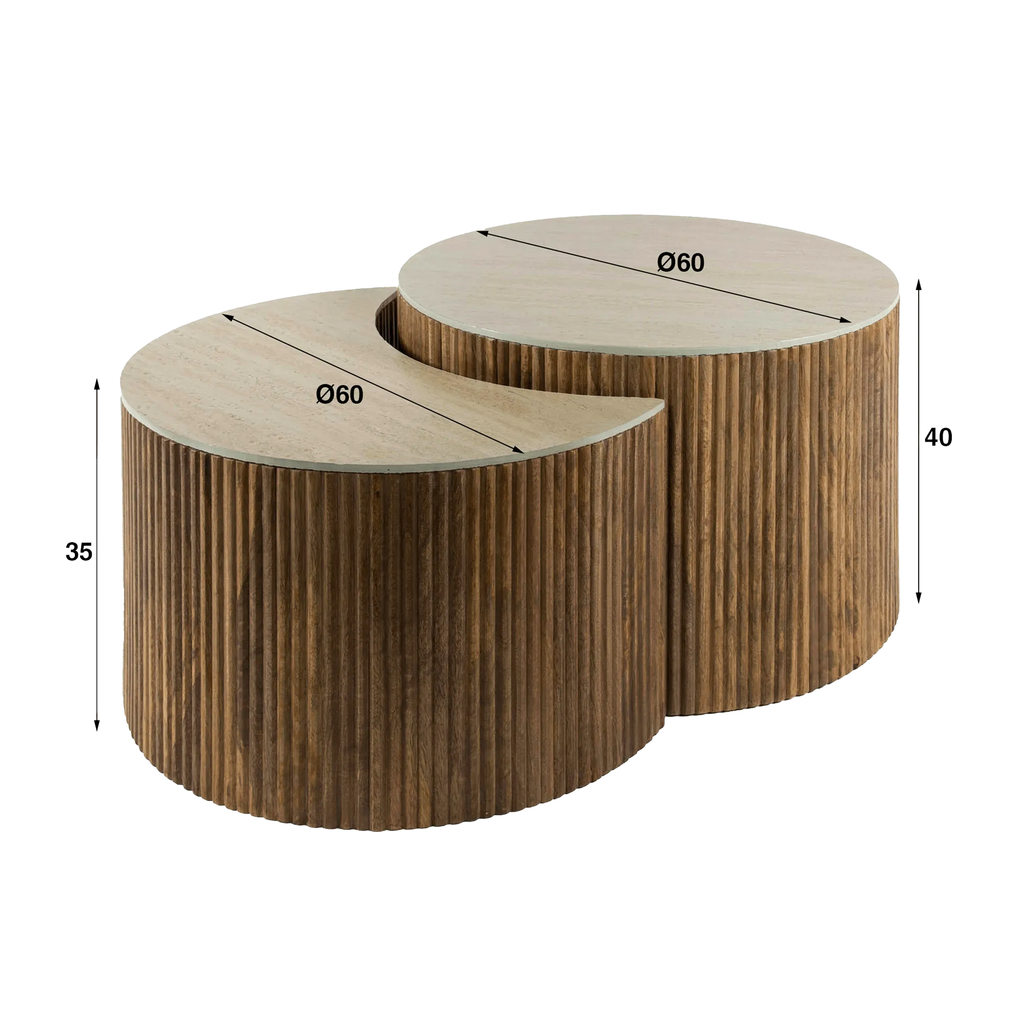 Elk onderdeel van deze halfronde salontafel in massief mangohout vormt, afhankelijk van de gekozen opstelling, een volledige of halve cirkel. De twee modules – beide met een diameter van 60 cm en hoogtes van respectievelijk 35 en 40 cm – schuiven harmonieus tegen elkaar aan of worden afzonderlijk geplaatst om de ruimte anders in te delen. Onze designers hebben het mangohout zorgvuldig bewerkt om het ritmische verticale reliëf te creëren, waarvan de schaduwval zacht verandert afhankelijk van het licht. Dit subtiele lijnenspel geeft visuele diepte en vormt een mooi contrast met het gladde oppervlak van de keramiek.