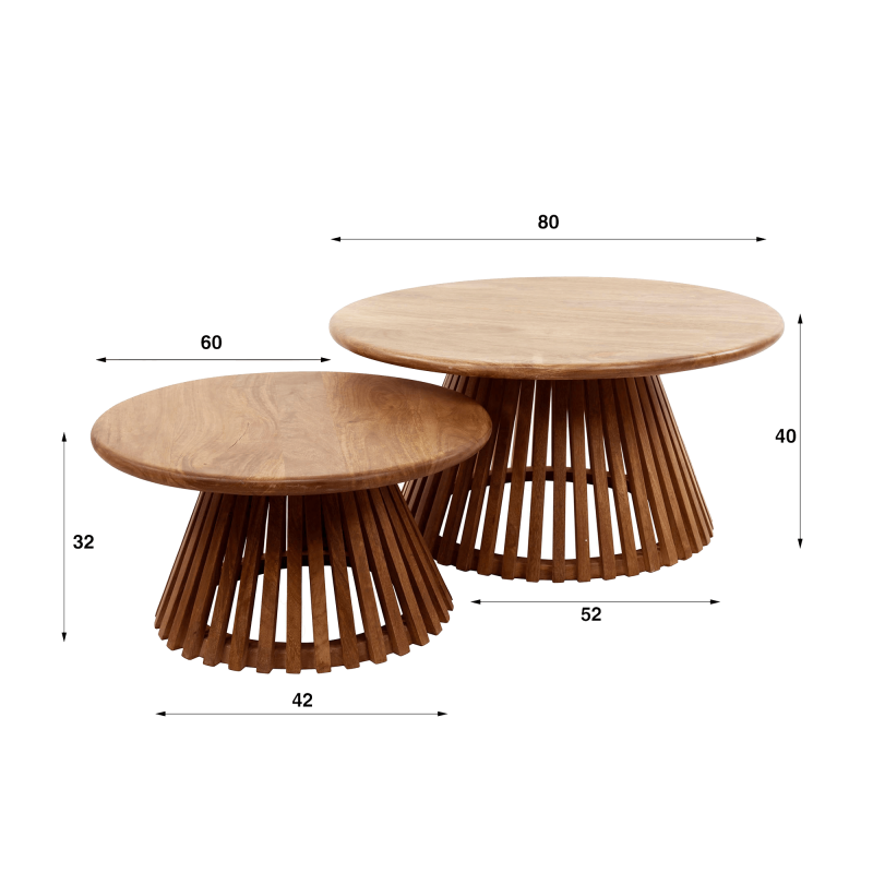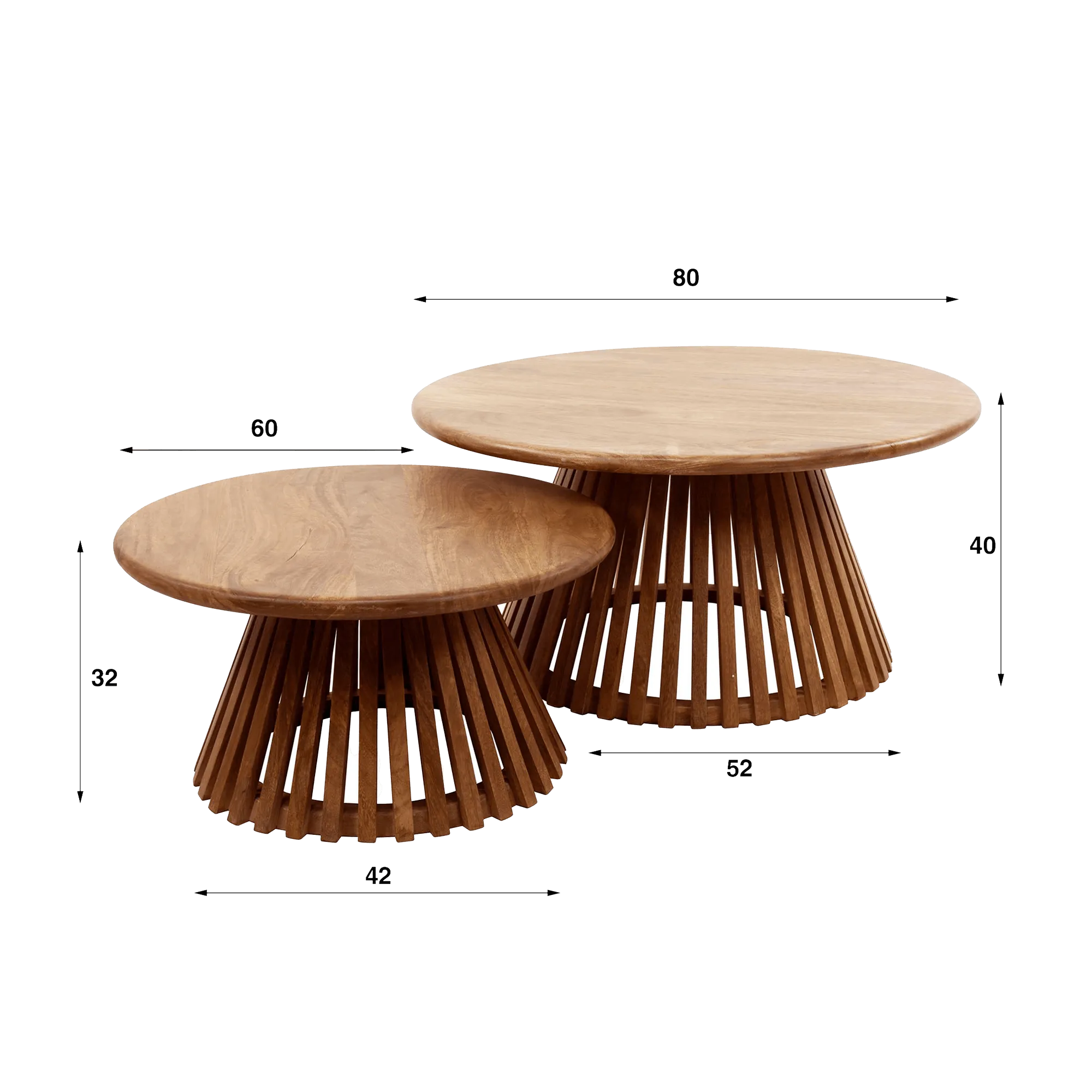 Conische salontafel in natuurlijk mangohout (set van 2) – Orbit 80/60 x 80/60 x 40/32 cm