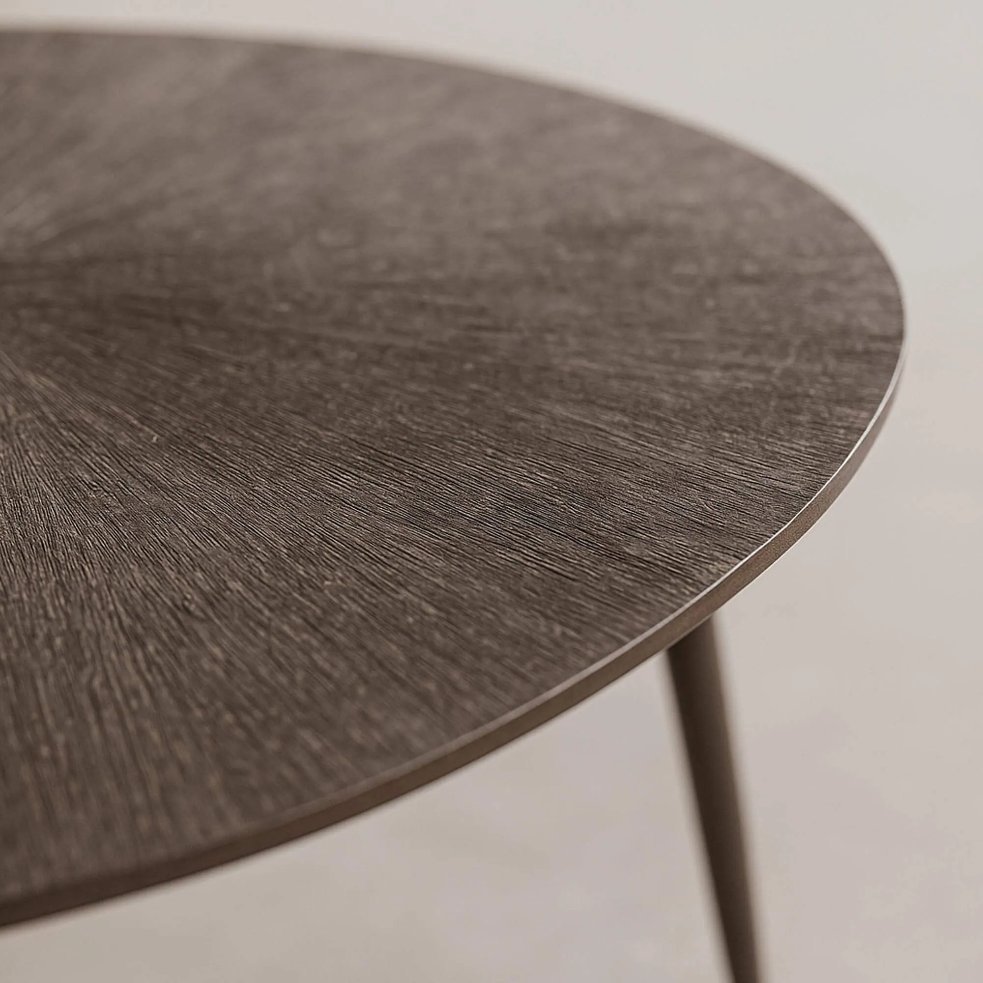 De gekozen bronzen afwerking voor deze salontafel in metaal, verkregen dankzij een subtiel gerayonneerde textuur, geeft elk blad een unieke vibratie. Bij aanraking onthult het oppervlak een fijne, bijna minerale reliëfstructuur die het centrale stralingspatroon versterkt. Dit materiaal is niet enkel bedoeld om bij de eerste blik te verleiden: het veroudert mooi, is bestand tegen dagelijks gebruik en blijft doorheen de dag met natuurlijk licht spelen.