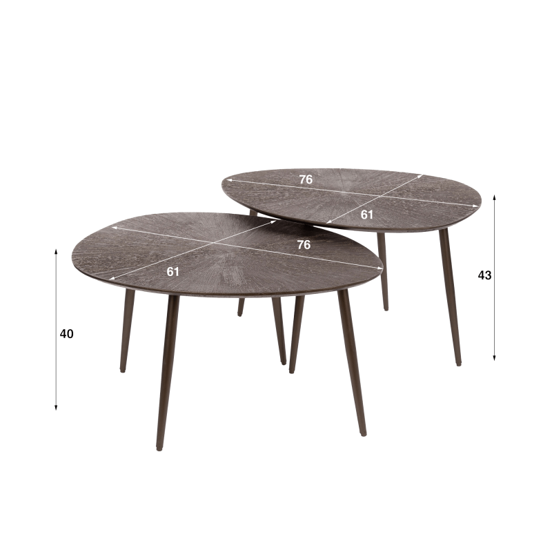 Onze bronzen metalen salontafel Nesso bestaat uit een grote tafel van 76 × 61 cm en een lagere tafel van eveneens 76 × 61 cm, die respectievelijk 43 cm en 40 cm hoog zijn. Dit zorgt voor een aangenaam spel van hoogtes in de woonkamer. Het geheel blijft visueel licht dankzij de slanke zwarte metalen poten, die we bewust fijn maar stabiel hebben ontworpen en die in enkele minuten eenvoudig te monteren zijn.