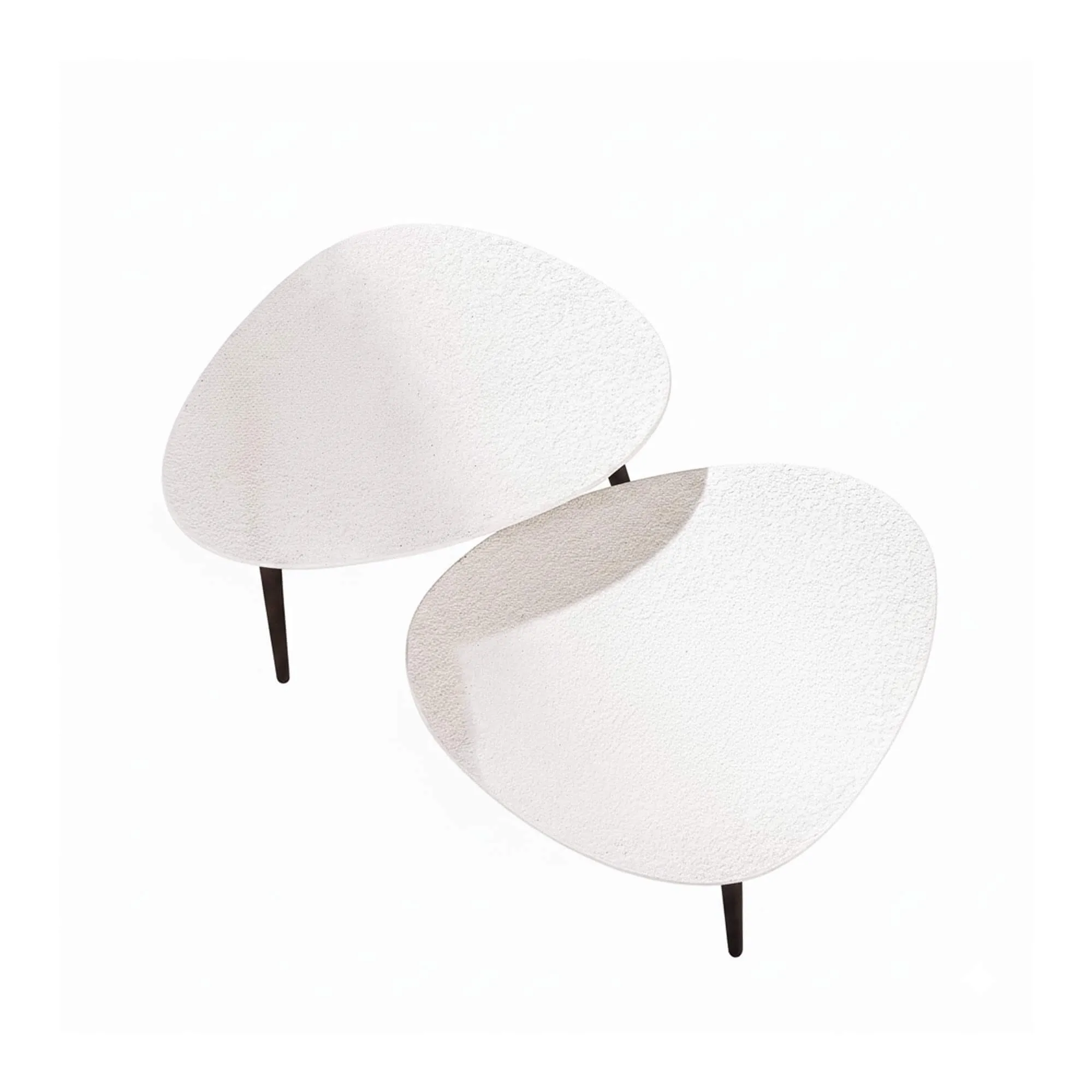 Met deze witte design salontafel in composietmarmer Arco in twee elementen hebben we een geheel gecreëerd dat tegelijk licht, uniek en natuurlijk uitnodigend is. Onze ontwerpers wilden twee stukken ontwikkelen die een woonkamer tot leven brengen zonder die te verzwaren: vormen geïnspireerd op gepolijste keien, verzachte lijnen en een subtiel samenspel tussen een getextureerd blad en slanke metalen poten. Dit evenwicht staat centraal in onze aanpak.