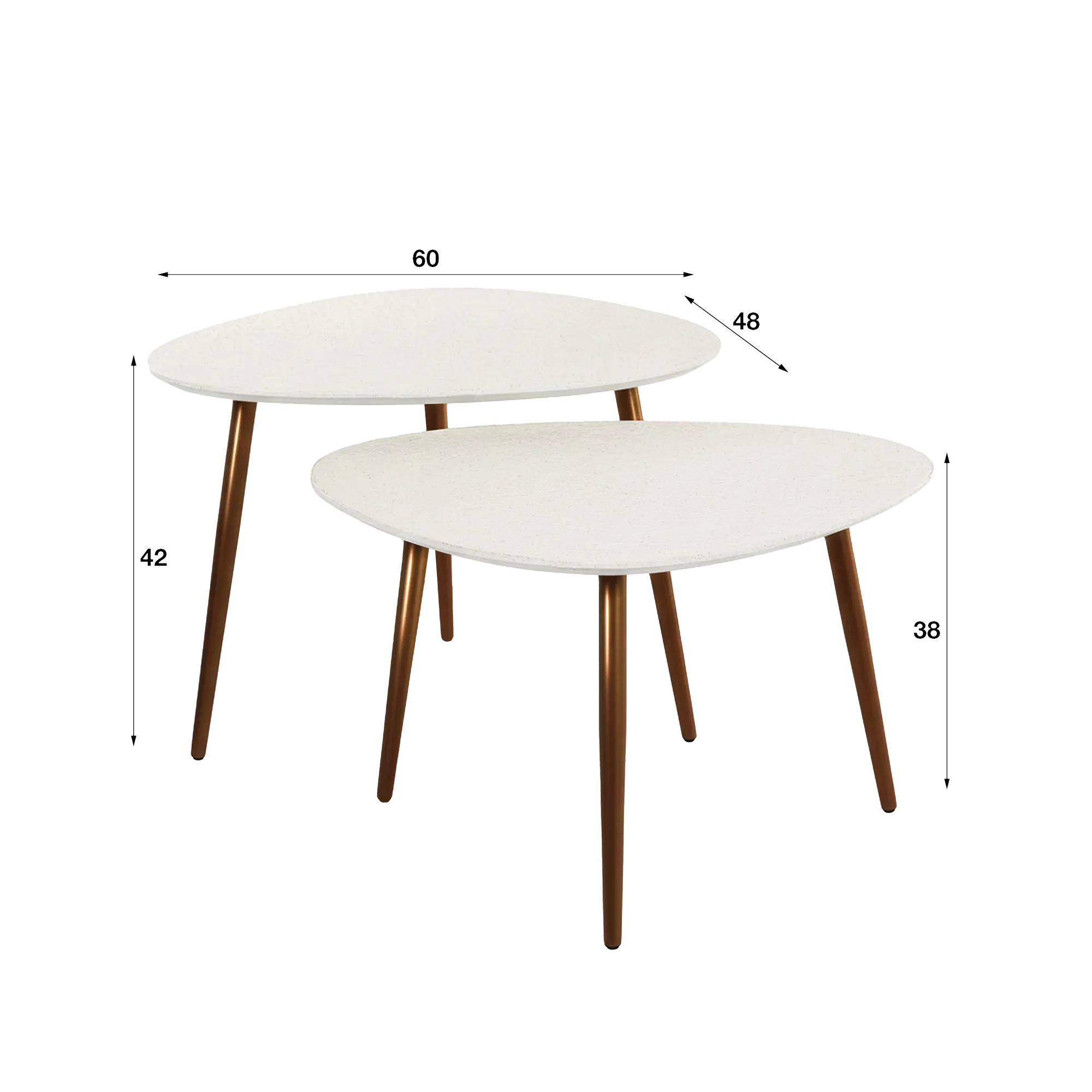 De afmetingen van de bladen van deze witte design salontafel in composietmarmer, 60 (L) x 48 (D) x 42 (H) cm voor de hoge tafel en 60 (L) x 48 (D) x 38 (H) cm voor de lage, laten toe om met hoogtes te spelen, een aangename visuele dynamiek te creëren en een gezellige ruimte rond de sofa samen te stellen.