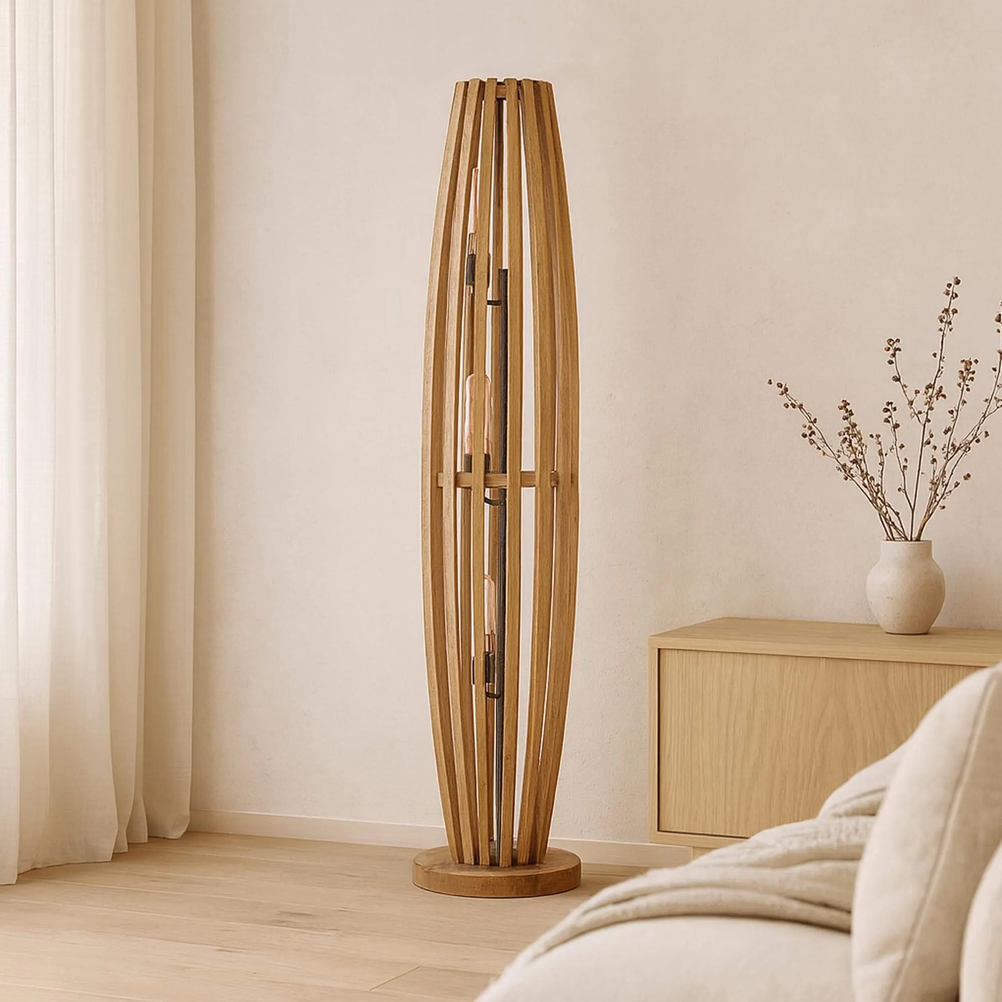 Ontstaan uit de wens om een verlichting te creëren die zowel rustgevend als expressief is, belichaamt de vloerlamp voor de woonkamer in massief mangohout Arken onze visie op natuurlijk design, waarbij het materiaal de vorm stuurt. Vanaf de eerste schetsen werkten onze designers rond één eenvoudig principe: het hout zonder opsmuk laten spreken, via een slanke en ritmische structuur, opgevat als een spel van verticale lijnen dat zowel het licht vangt als de ruimte structureert.