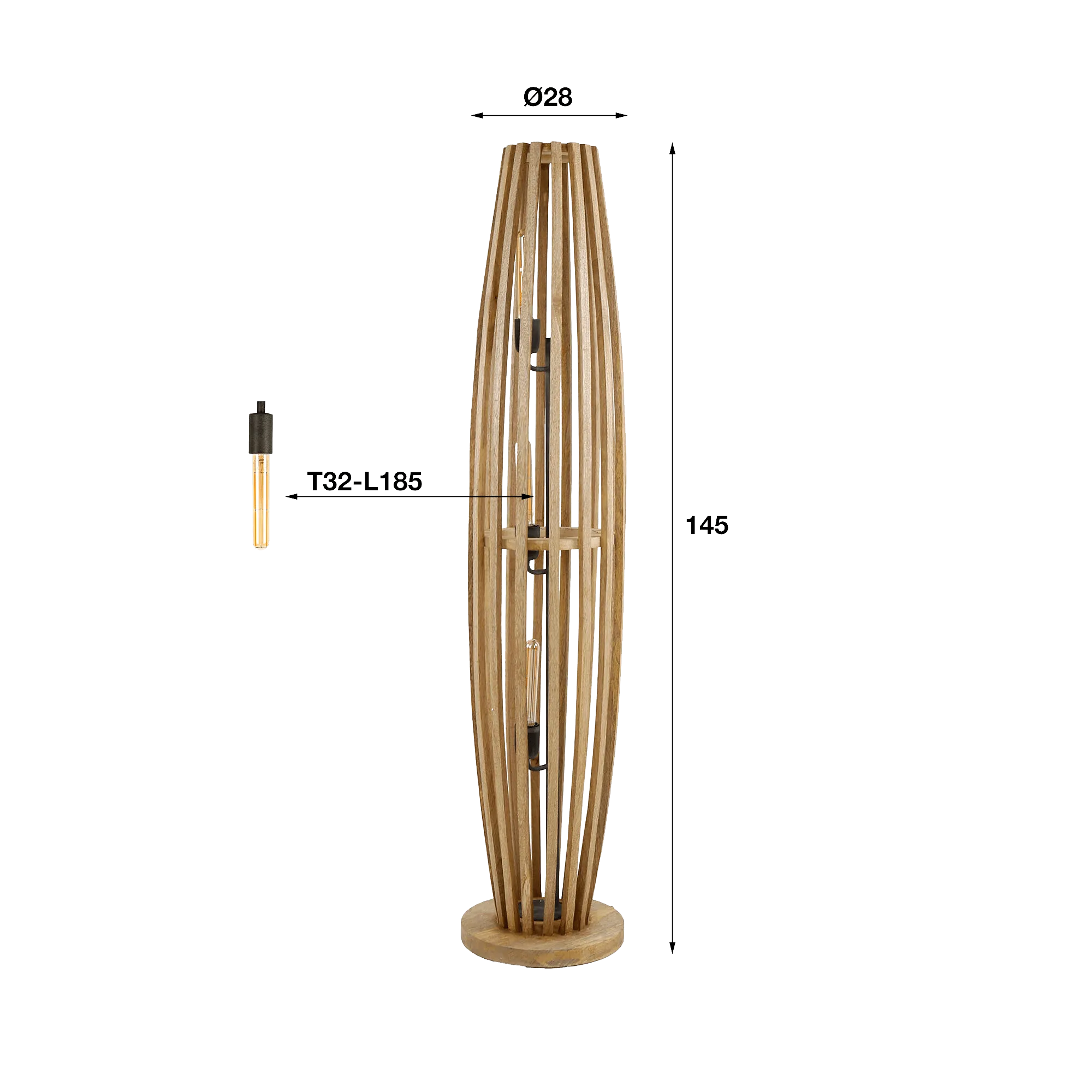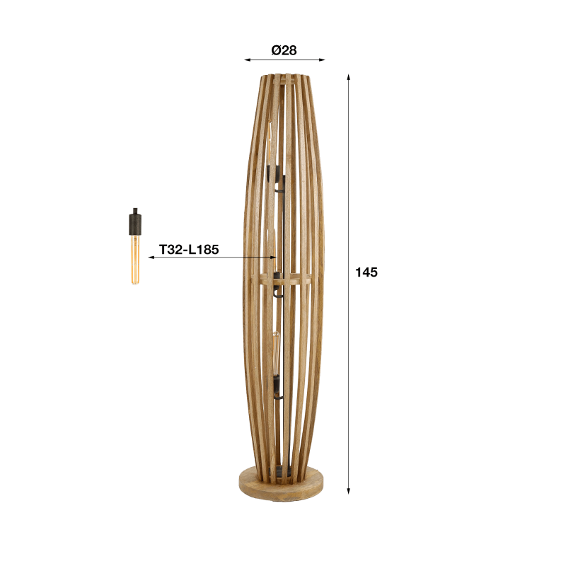 Met een hoogte van ongeveer 145 cm en een diameter van circa 28 cm vindt deze vloerlamp voor de woonkamer in massief mangohout vanzelf haar plaats in de woonkamer, naast een sofa of in een hoek die extra in de kijker mag staan. De ronde voet, stabiel en discreet, zorgt voor een goed visueel evenwicht en verankert het geheel op de vloer. Binnenin wordt een buisvormige lichtbron met referentie T32-L185 (niet inbegrepen) in het hart van de structuur geplaatst, wat zorgt voor een elegante verticale verlichting waarvan de reflecties met de openingen in het hout spelen en een warme, rustgevende sfeer creëren.