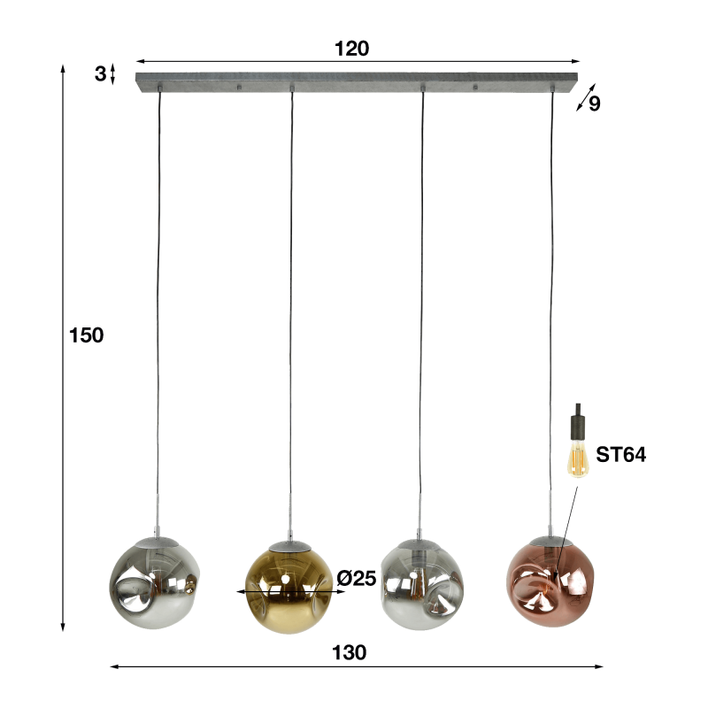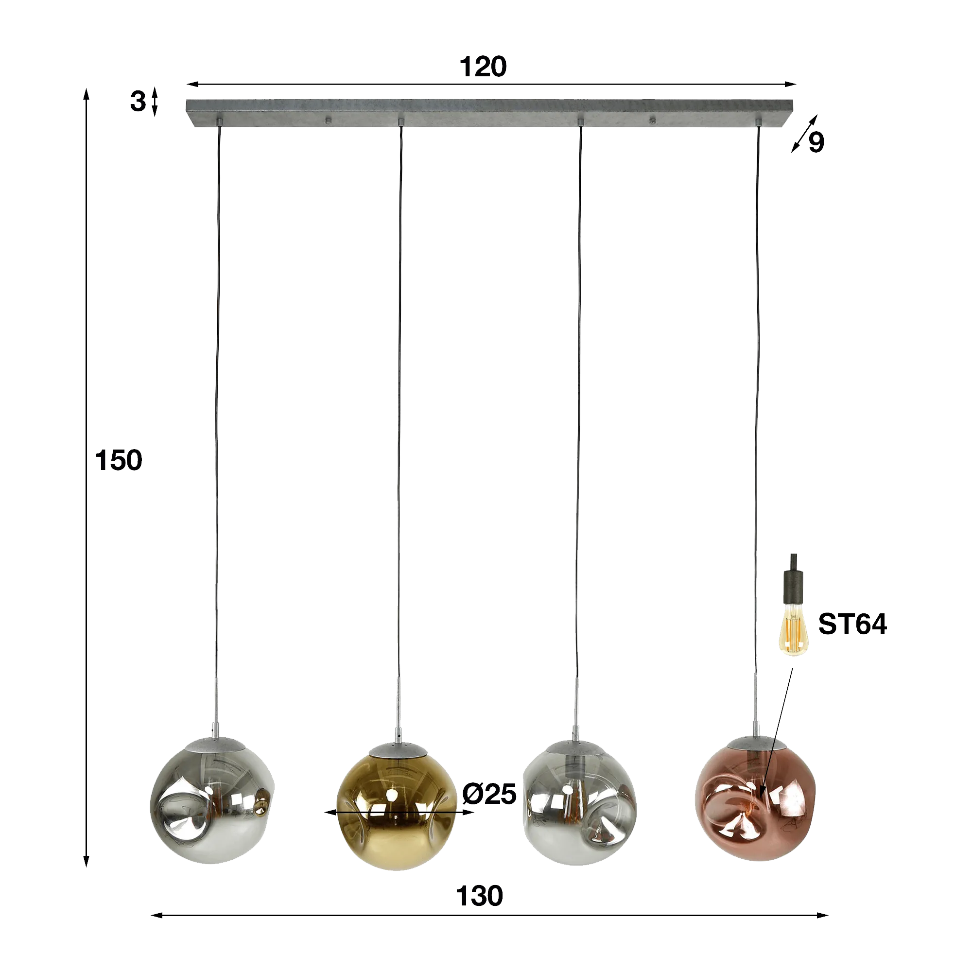 Voor deze industriële metalen hanglamp met glazen kappen kozen we bewust voor een discrete metalen structuur, zodat de vier glazen bollen volledig tot hun recht komen. De kabels, verstelbaar tot 150 cm, maken het mogelijk de hoogte af te stemmen op de gewenste sfeer: een lagere verlichting voor een intieme ambiance, of hoger geplaatst voor grote volumes. Deze flexibiliteit vloeit voort uit onze wens om een armatuur te creëren dat zowel in een hedendaags interieur als in een meer uitgesproken industrieel decor tot zijn recht komt.