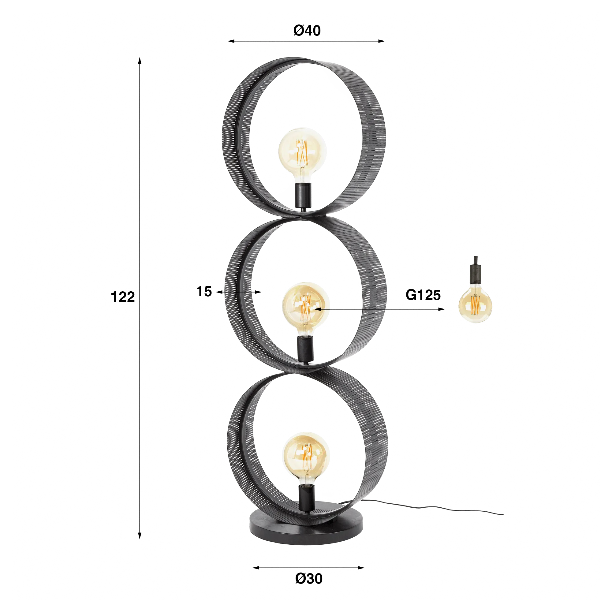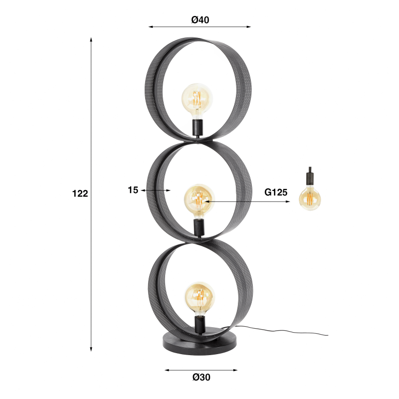 Gemaakt van metaal onthult de structuur van deze staande lamp in metaal met antracietafwerking een geperforeerde textuur die het licht zacht laat doorfilteren. We hebben het ontwerp van de ringen zo uitgewerkt dat ze een sterke visuele aanwezigheid behouden zonder de ruimte te verzwaren. Met een hoogte van ongeveer 122 cm rijst de lamp licht en elegant op, gedragen door een ronde voet van 30 cm diameter die voor stabiliteit en stevigheid zorgt.