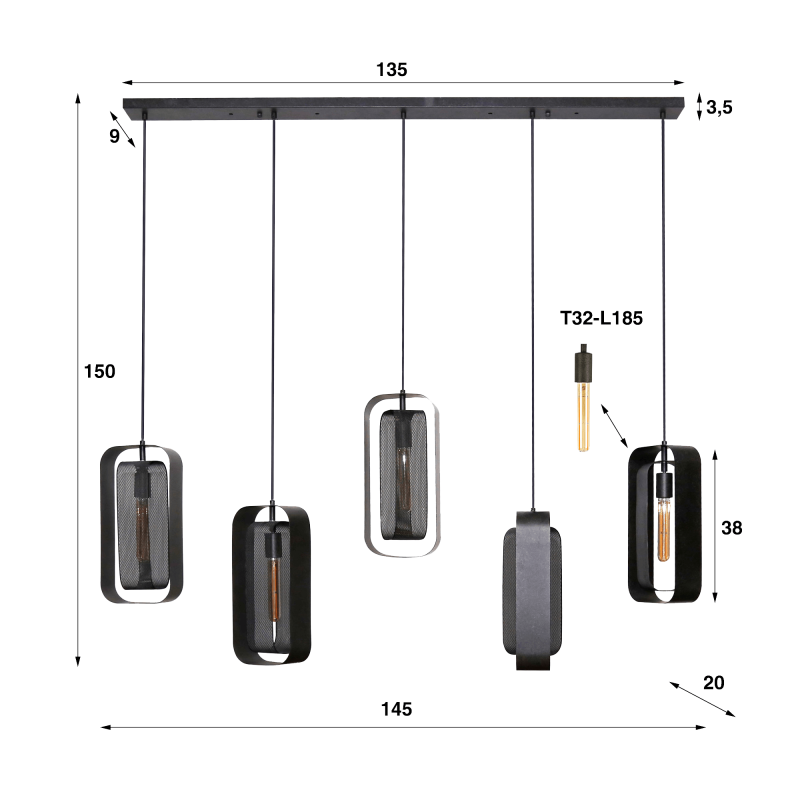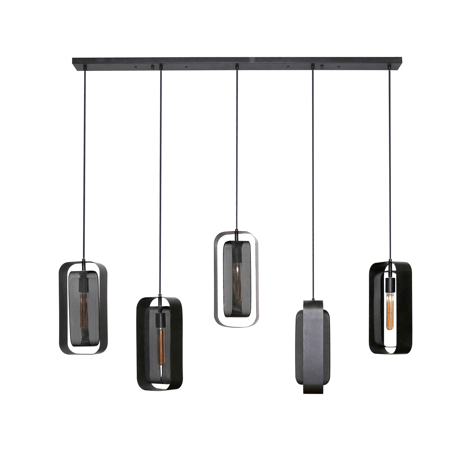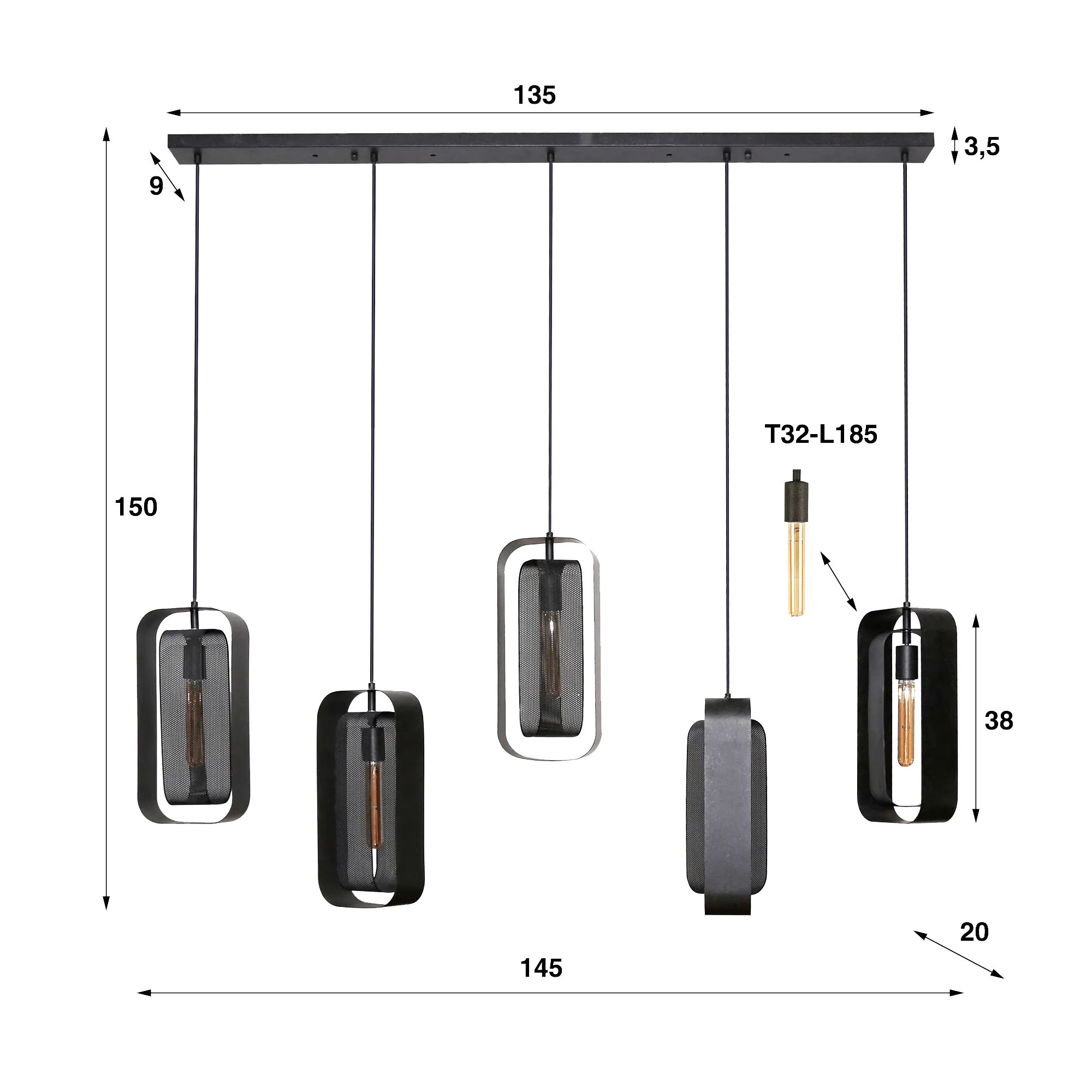 De vijf kappen waaruit dit industrieel metalen hangarmatuur bestaat, ontworpen als verticale modules, vormen een luchtige compositie. We kozen bewust voor royale proporties, met structuren van ongeveer 38 cm hoogte, die een sterke aanwezigheid bieden en toch visueel licht blijven. Het geheel spreidt zich uit over een breedte van ongeveer 145 cm: een doordachte afmeting om boven een grote eettafel te plaatsen of om een open leefruimte te structureren. De kabels, verstelbaar tot 150 cm, maken het mogelijk de hoogtes te variëren en de compositie perfect af te stemmen op het volume van de ruimte.