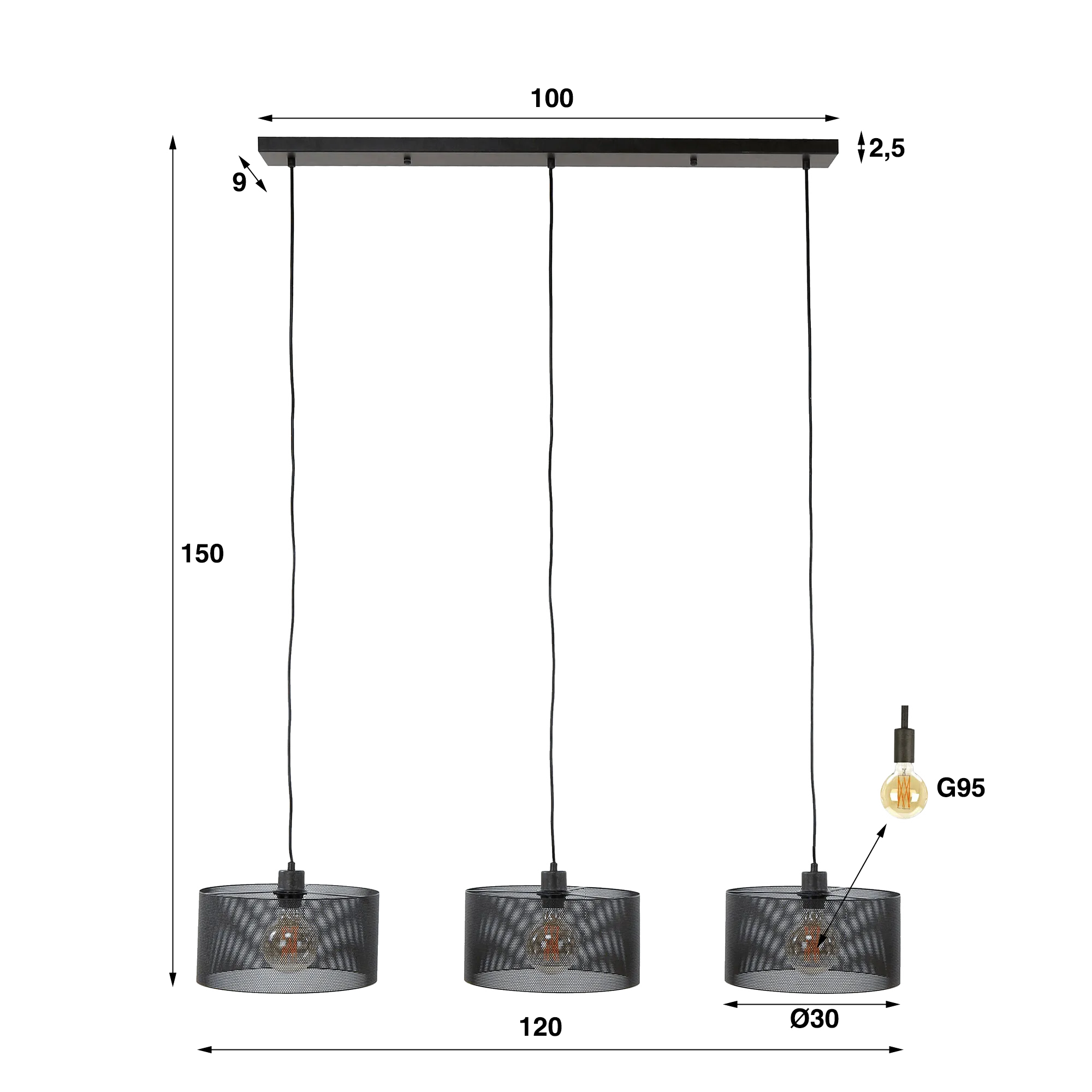 De drie lampen, opgehangen aan een stang van 100 cm, zorgen voor een visueel evenwicht en structureren de ruimte. Met een verstelbare hoogte tot 150 cm past deze industriële metalen hanglamp zich aan verschillende configuraties aan: boven een eettafel, een keukeneiland of in een woonkamer waar men een uitnodigende sfeer wil creëren, versterkt door G95 LED-filamentlampen (niet inbegrepen). Het metalen gaas werpt een subtiel spel van schaduwen op de muren en creëert een unieke, bijna grafische sfeer die we tijdens het ontwerpen bijzonder waardeerden.