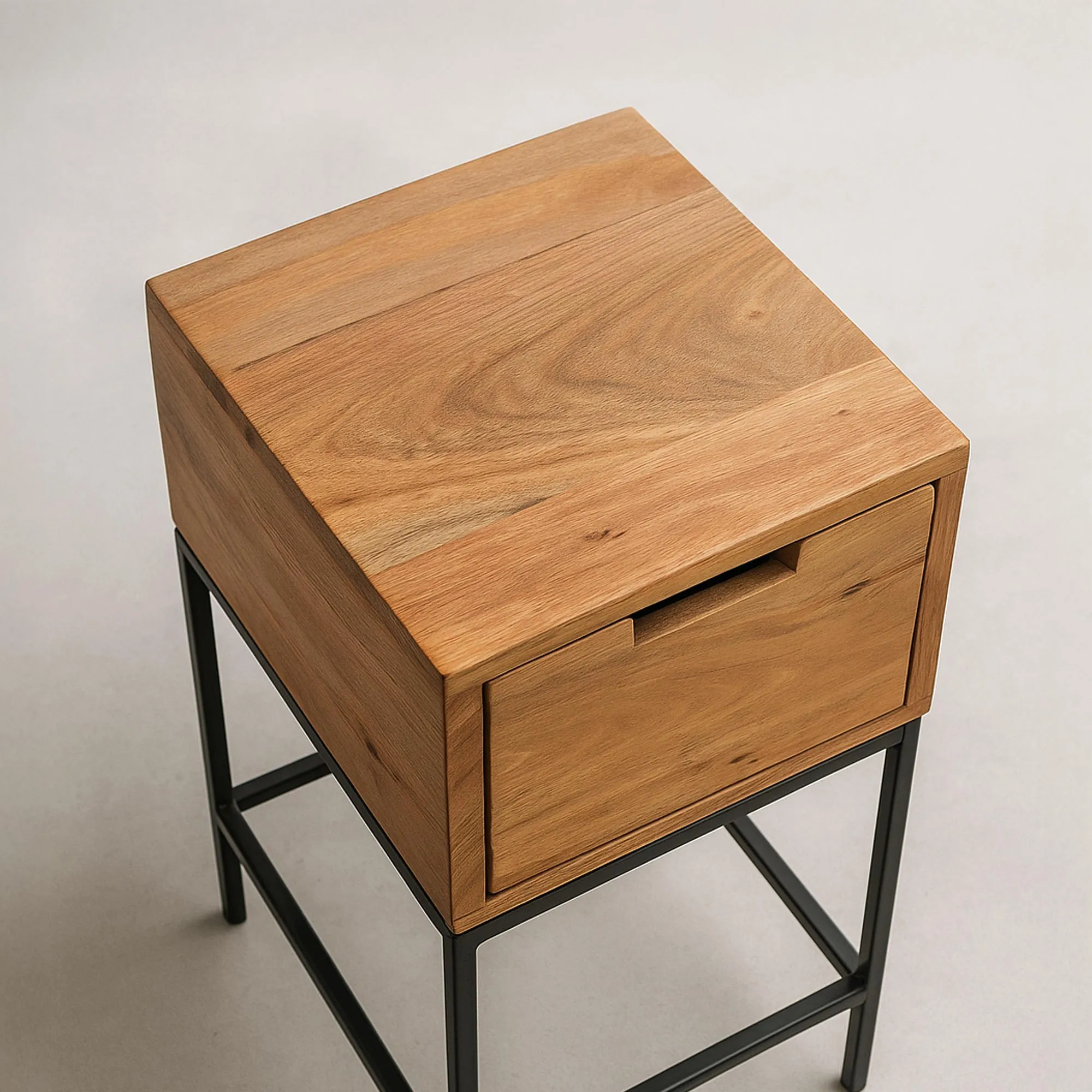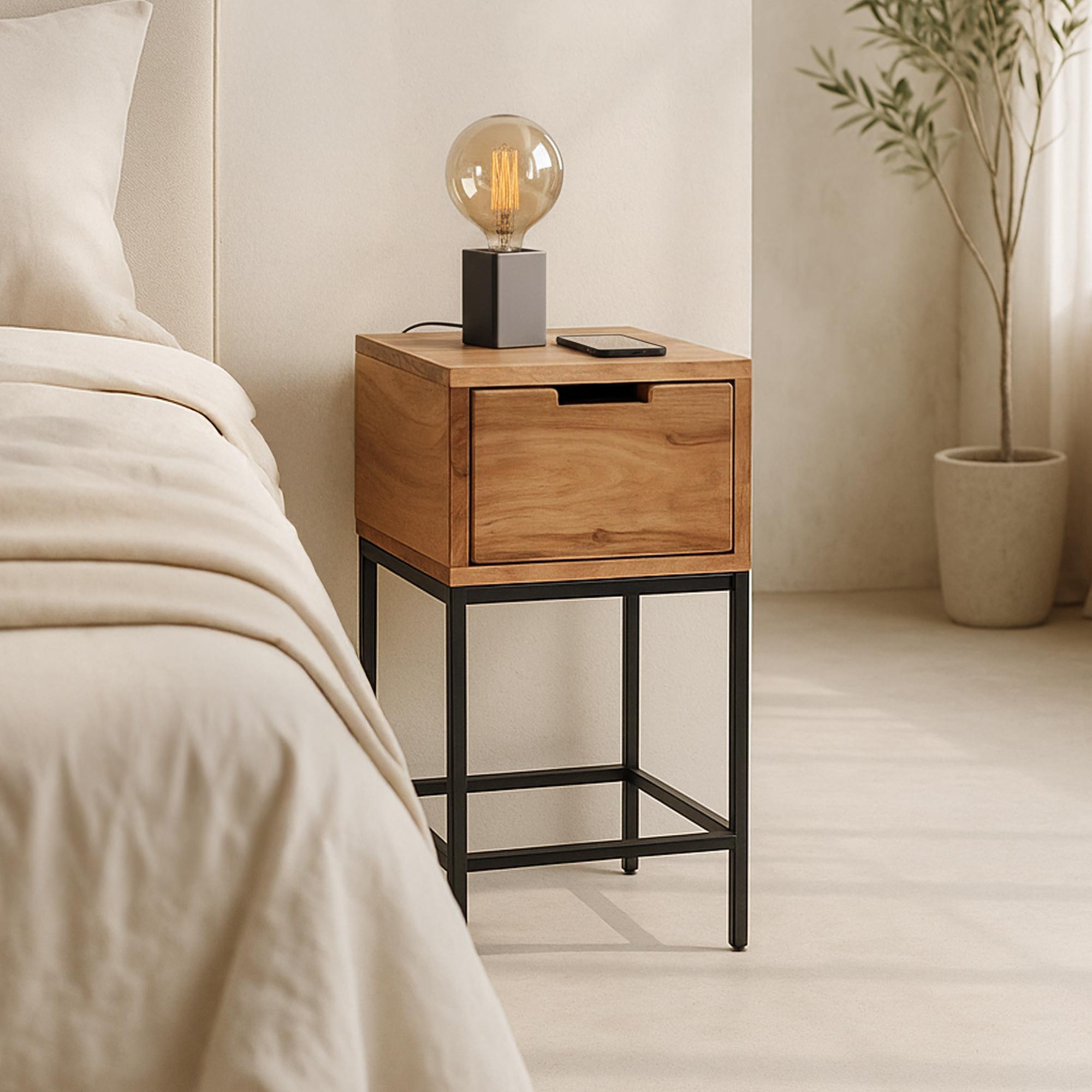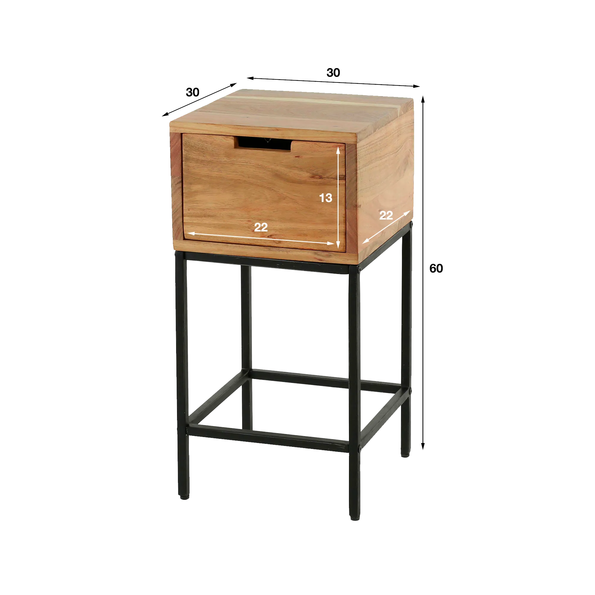 Functioneel zonder opzichtig te zijn, beschikt het nachtkastje over een lade met goed doordachte verhoudingen, met ongeveer 22 cm nuttige breedte en 13 cm binnenhoogte. Ideaal voor boeken, brillen of persoonlijke voorwerpen, terwijl het bovenblad van 30 x 30 cm beschikbaar blijft voor een lamp, wekker of telefoon. De totale hoogte van ongeveer 60 cm maakt dit industriële nachtkastje in hout en metaal comfortabel in gebruik, zowel bij een laag bed als bij een hoger bedframe.