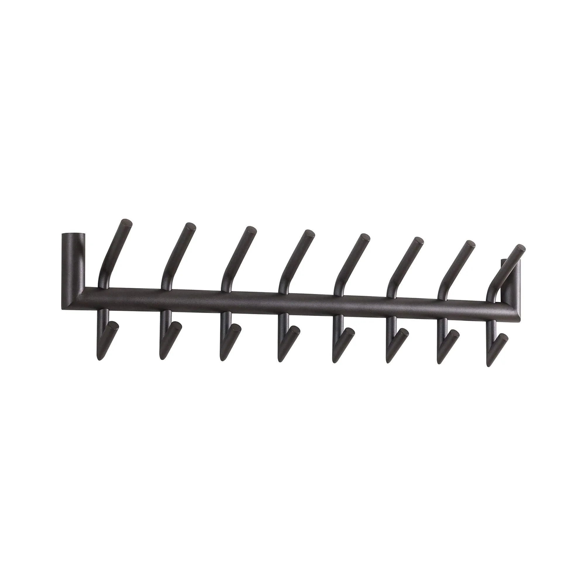 Volledig vervaardigd uit metaal, onderscheidt de industriële metalen wandkapstok Nord zich door de kwaliteit van het materiaal en een diepe zwarte afwerking met een licht gestructureerde touch. Dit oppervlak vangt het licht op subtiele wijze en onthult de nuances van het metaal zonder ooit te overheersen. Onze designers hebben de vormen van de haken zorgvuldig uitgewerkt: licht hellend bieden ze een natuurlijke grip voor jassen, mantels of tassen, terwijl ze voorkomen dat textiel wegglijdt. Het geheel vormt een evenwichtig silhouet, tegelijk grafisch en warm, trouw aan de industriële stijl die wij graag verfijnd herinterpreteren.