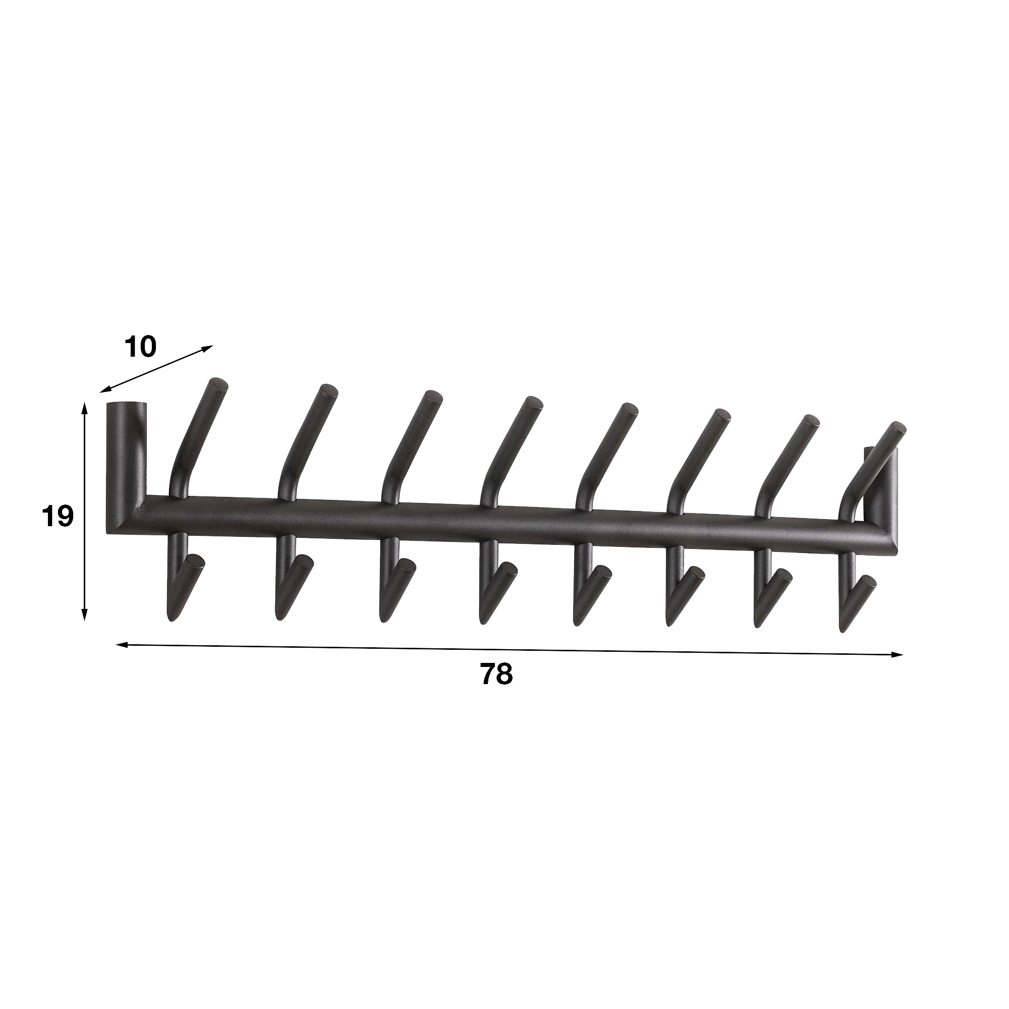 Met een lengte van 78 cm vindt de industriële metalen wandkapstok Nord moeiteloos zijn plaats in een inkomhal, een gang of zelfs een slaapkamer. De beperkte hoogte van 19 cm zorgt voor een comfortabele installatie zonder de muur te verzwaren, terwijl de diepte van ongeveer 10 cm voldoende ruimte biedt om meerdere items tegelijk op te hangen. De haken zijn gelijkmatig over de volledige structuur verdeeld en zorgen voor een royale en overzichtelijke opbergruimte, perfect afgestemd op het dagelijkse ritme.