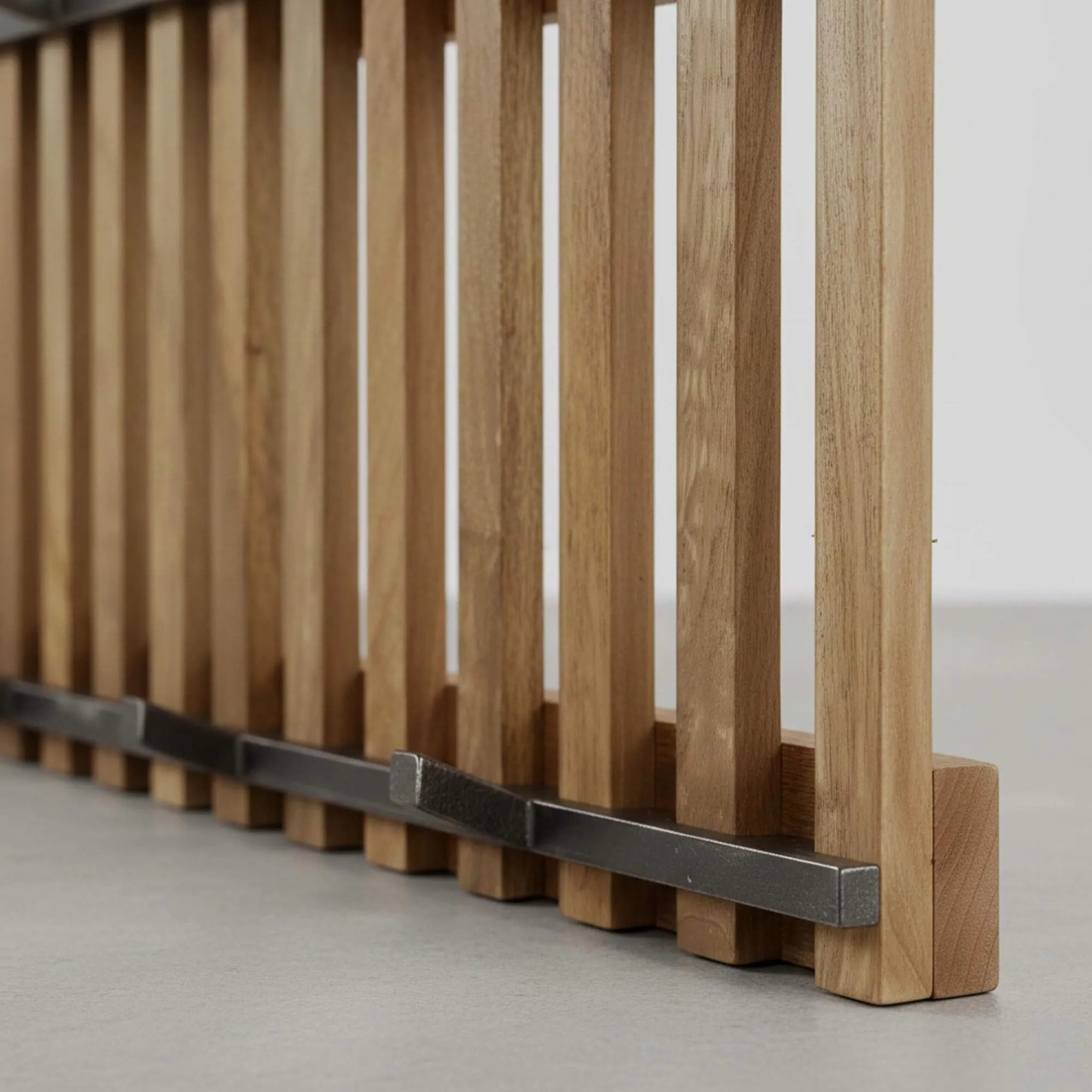 Uitgevoerd in massief mangohout, verleidt de wandkapstok Tweak met de natuurlijke warmte van zijn houtnerf en de diepte van zijn nuances, subtiel benadrukt door een verfijnde afwerking. De verticale, regelmatige en gelijkmatig verdeelde latten creëren een elegant visueel ritme en verlichten tegelijk het silhouet van het geheel. Op deze houten structuur zijn metalen kapstokhaken bevestigd met een bewust ruwe uitstraling, waarvan de licht korrelige textuur contrasteert met het zachtere gevoel van het hout. Deze dialoog tussen materialen vormt de kern van de identiteit van deze collectie.