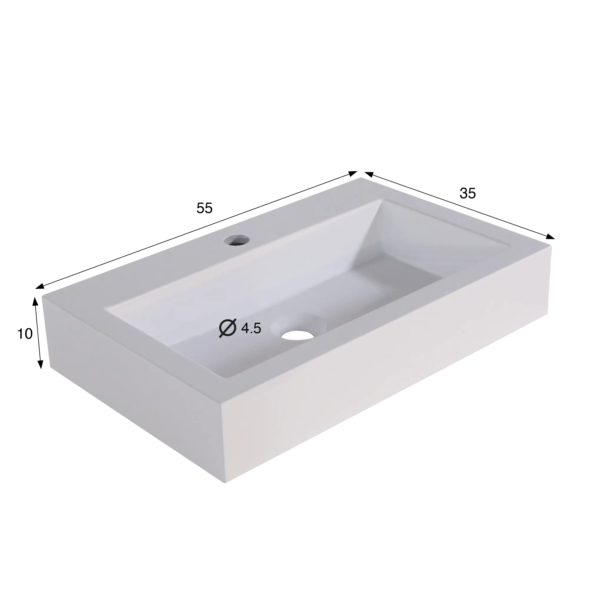 Met royale afmetingen van 55 cm breedte, 35 cm diepte en een hoogte van 10 cm biedt onze rechthoekige opbouw waskom in mat wit keramiek, Odon, een goed geproportioneerde waterzone die aangenaam is in gebruik zonder het meubel visueel te verzwaren. De discrete boring voor de kraan en de centrale afvoeropening van 4,5 cm zijn harmonieus in het ontwerp geïntegreerd, zonder de esthetische balans te verstoren.