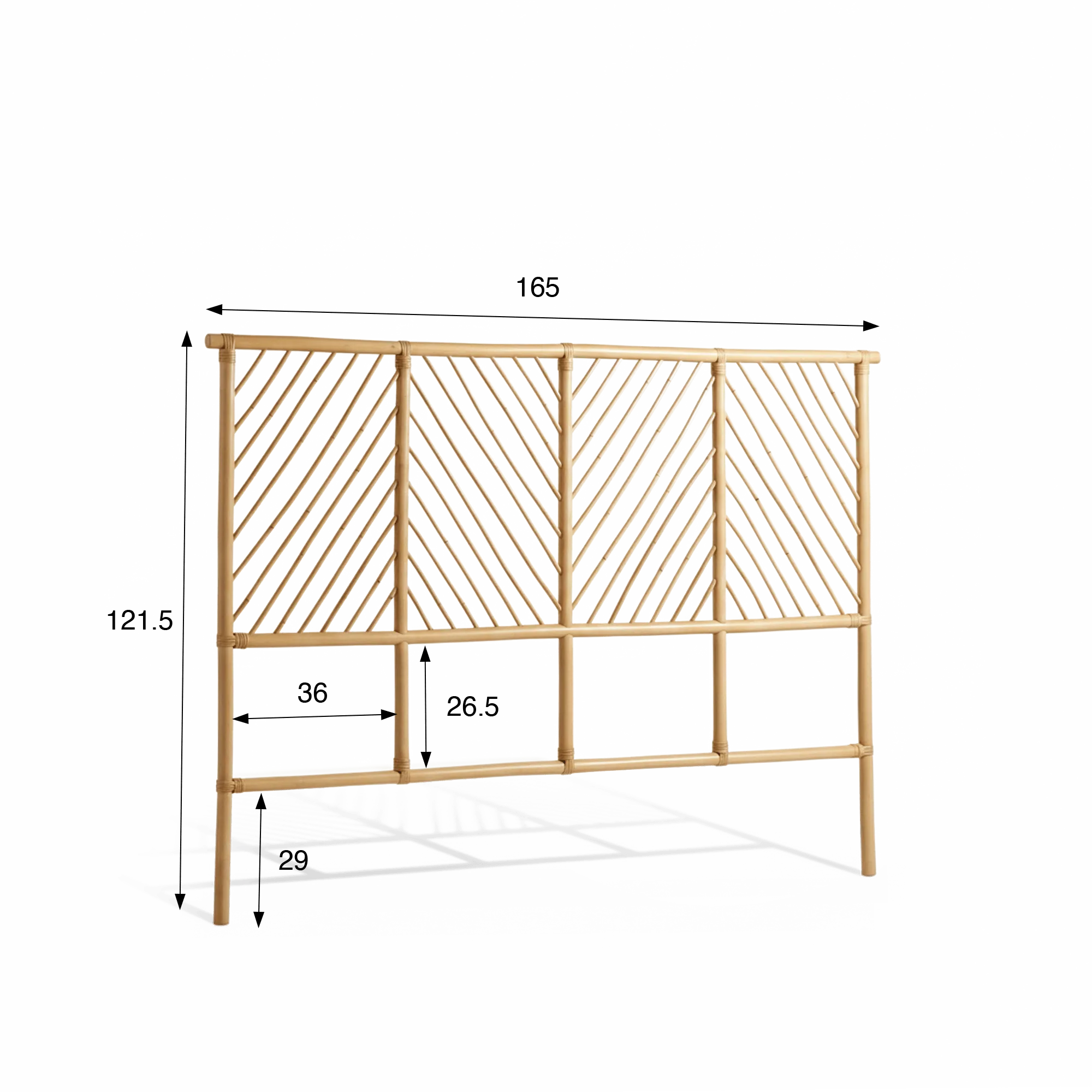 Met zijn breedte van 160 cm past het Manoa hoofdbord van 160 cm in riet (rotan) perfect bij standaard tweepersoonsbedden en structureert het het bed met precisie. De totale hoogte van 121,5 cm creëert een echt visueel ankerpunt, terwijl de proporties luchtig blijven voor een open sfeer. De verticale stijlen, verbonden door zorgvuldig samengestelde dwarslatten, zorgen voor duurzame stabiliteit en dagelijks comfort, zowel om tegenaan te leunen tijdens het lezen als ter ondersteuning van kussens.