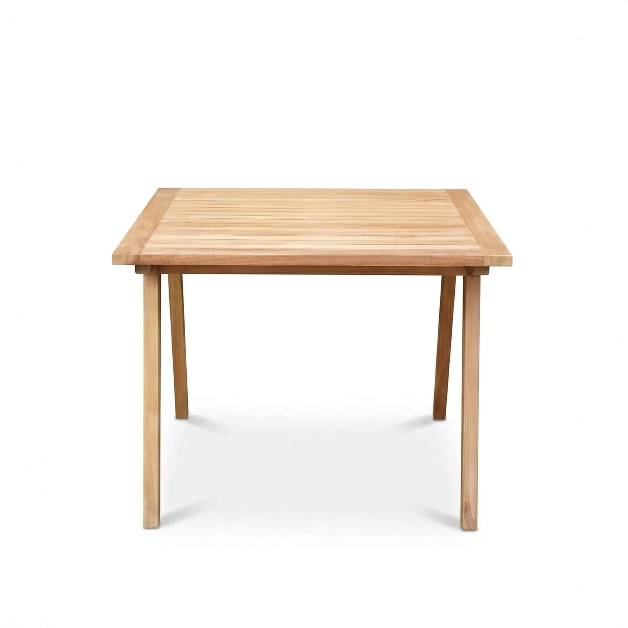 Het tafelblad van deze vierkante houten tuintafel in teakhout voor 4 personen, opgebouwd uit fijne, zorgvuldig uitgelijnde latten, benadrukt het materiaal en vergemakkelijkt tegelijk de afvoer van water, een discreet detail dat bijdraagt aan het duurzaam behoud van de kwaliteit van het hout bij buitengebruik. We besteedden bijzondere aandacht aan het ontwerp van de licht taps toelopende poten, waarvan de helling een visuele lichtheid toevoegt die geïnspireerd is op de Scandinavische stijl. Dit streven naar evenwicht tussen stabiliteit en verfijning geeft de vierkante houten tuintafel in teakhout voor 4 personen Roku een natuurlijke uitstraling, die zich moeiteloos laat integreren in zowel een eigentijdse omgeving als in een meer authentieke sfeer.