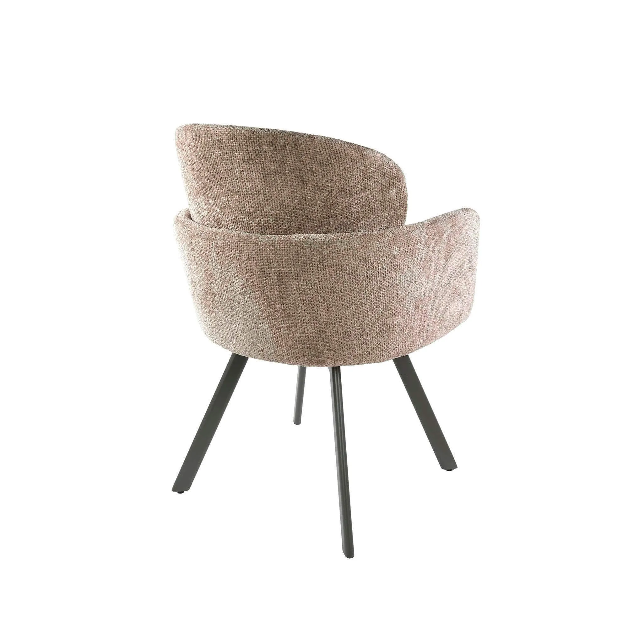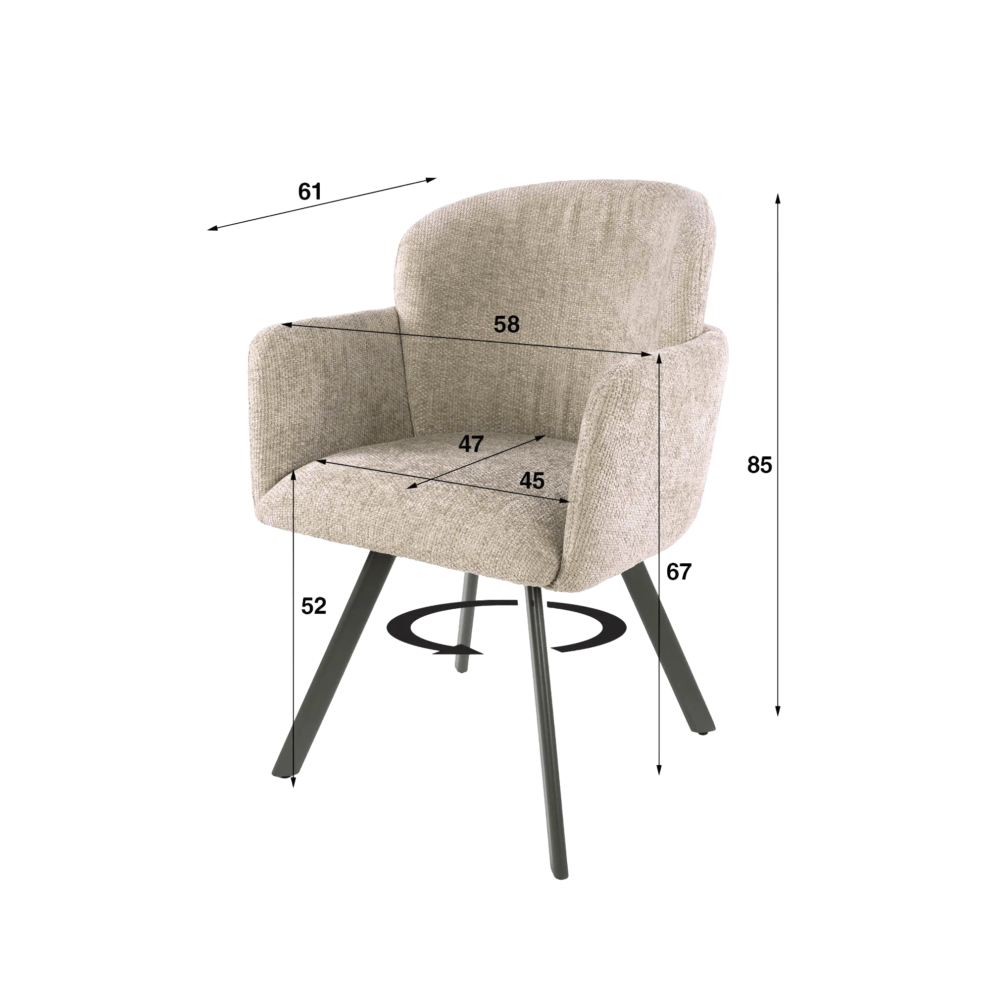 De royale zitting van deze draaifauteuil, bekleed met een stof met een dichte structuur en een aangenaam gevoel, omsluit het lichaam met zachtheid. We hebben bijzonder veel aandacht besteed aan de stevigheid van de bekleding, geselecteerd omwille van haar weerstand en haar vermogen om er mooi te blijven uitzien doorheen de tijd. De licht gebogen rugleuning en de geïntegreerde armleuningen volgen de bewegingen vanzelfsprekend en nodigen uit om langer te genieten van gedeelde momenten rond de tafel. Met een totale hoogte van ongeveer 85 cm en een comfortabele breedte van circa 61 cm biedt de draaifauteuil Navi het juiste evenwicht tussen uitgesproken aanwezigheid en visuele lichtheid.