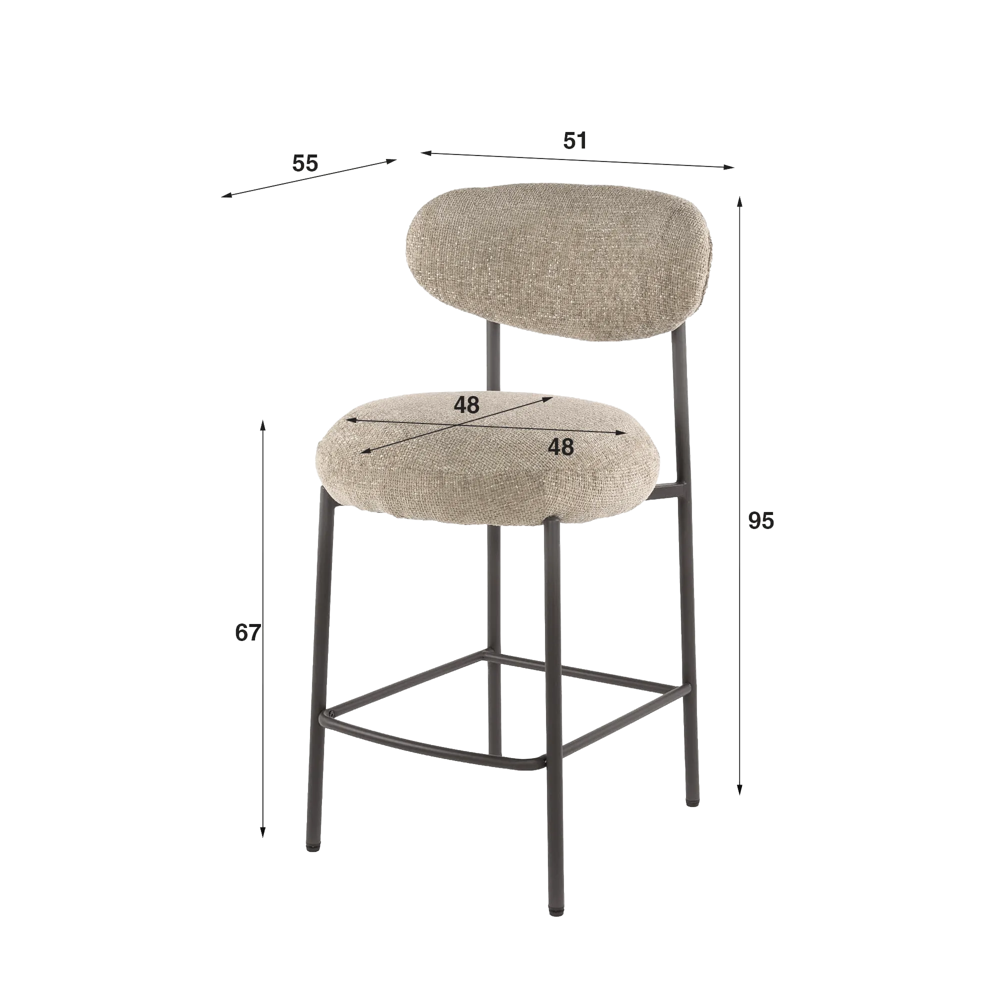 Het silhouet van onze keukenbarstoel voor kookeiland Kai valt op door zachte, mooi geproportioneerde lijnen. De royale zitting en de subtiel afgeronde rugleuning bieden aangename ondersteuning, ontworpen om langer tafelen moeiteloos comfortabel te maken. De stof, gekozen omwille van haar duurzaamheid en aangename touch, vangt het licht op een verfijnde manier en brengt een warm, visueel gevoel. De licht gemêleerde textuur versterkt de indruk van langdurig comfort, terwijl ze tegelijk heel praktisch blijft in het dagelijkse gebruik.