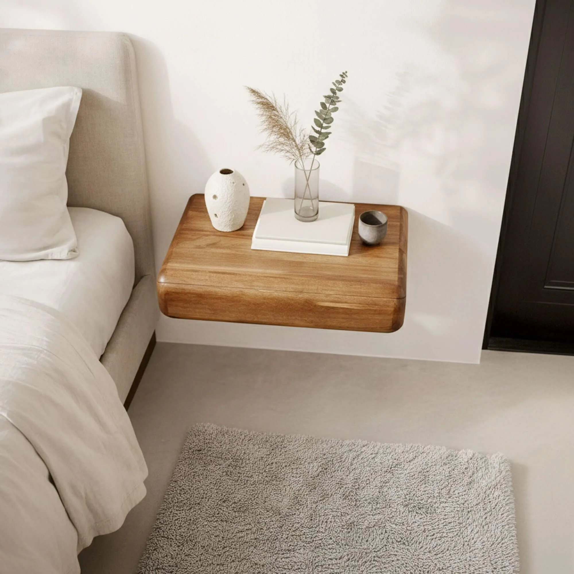 Met afmetingen van ongeveer 45 cm breed, 35 cm diep en 10 cm hoog past dit hangend nachtkastje in massief hout met lade moeiteloos in compacte slaapkamers én in ruimere opstellingen. De lade, discreet maar doeltreffend, biedt een bruikbare binnenruimte van ongeveer 36 cm breed, circa 25 cm diep en 6 cm hoog — ideaal om een boek, bril of persoonlijke spullen binnen handbereik te houden zonder het blad te overbelasten.