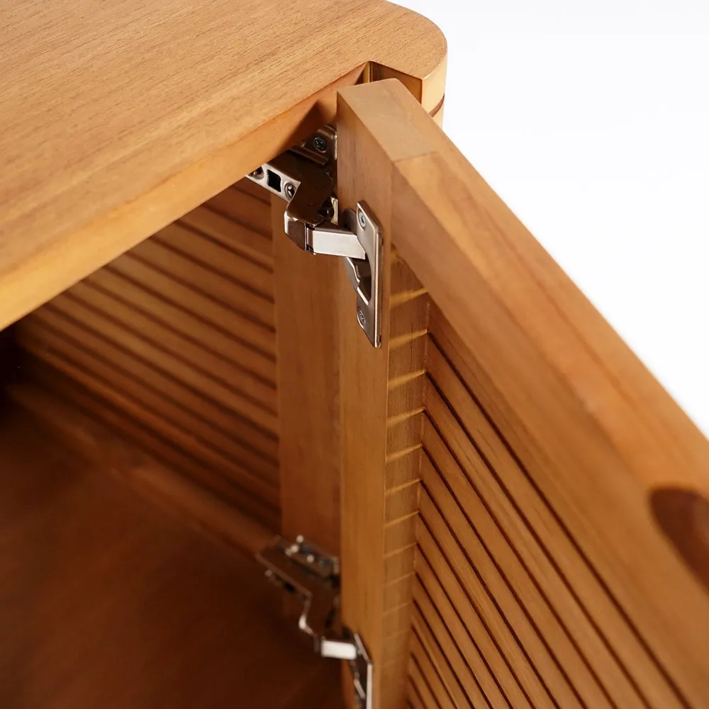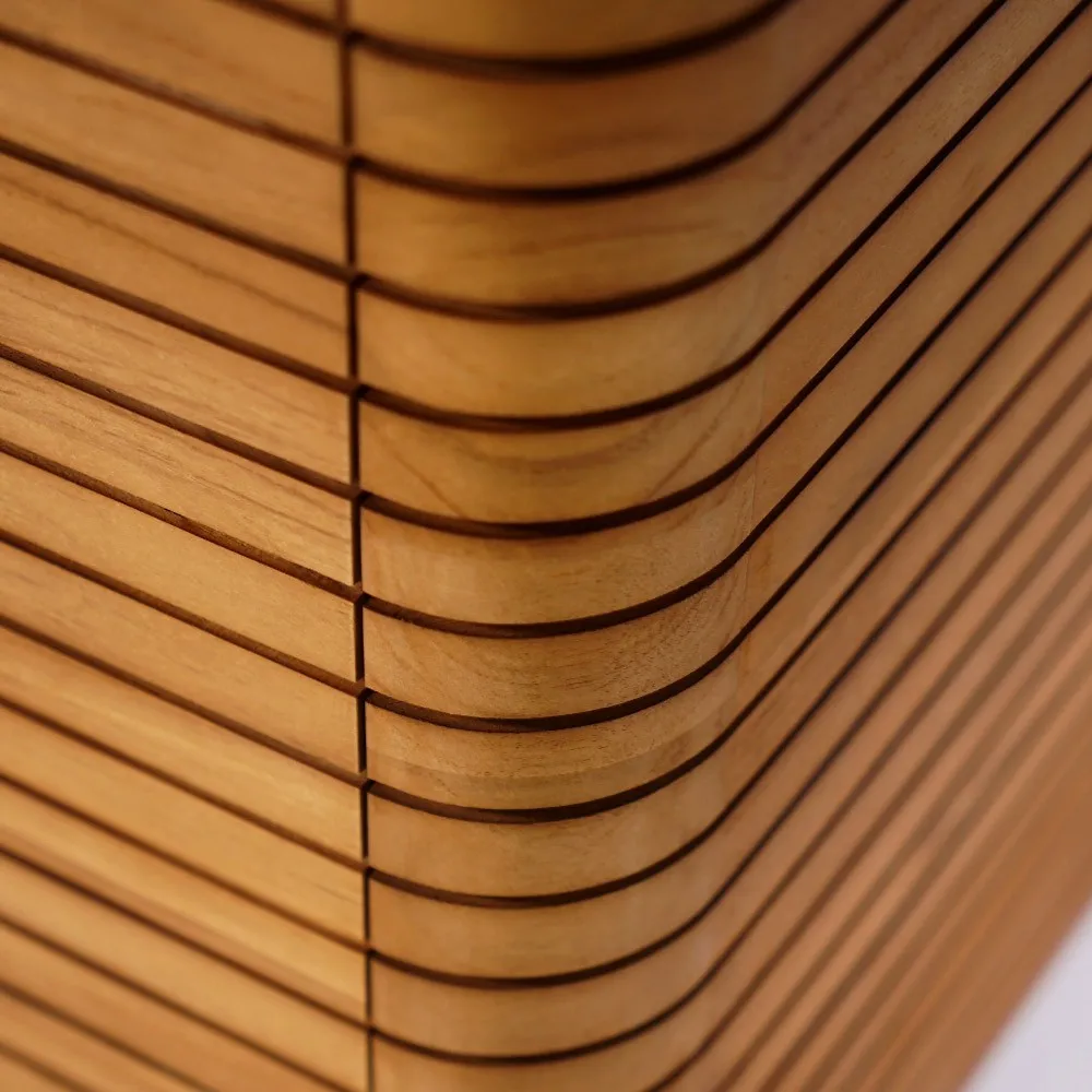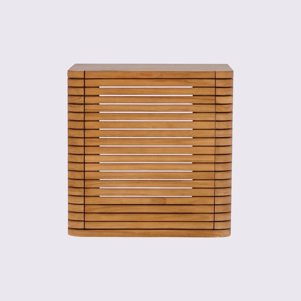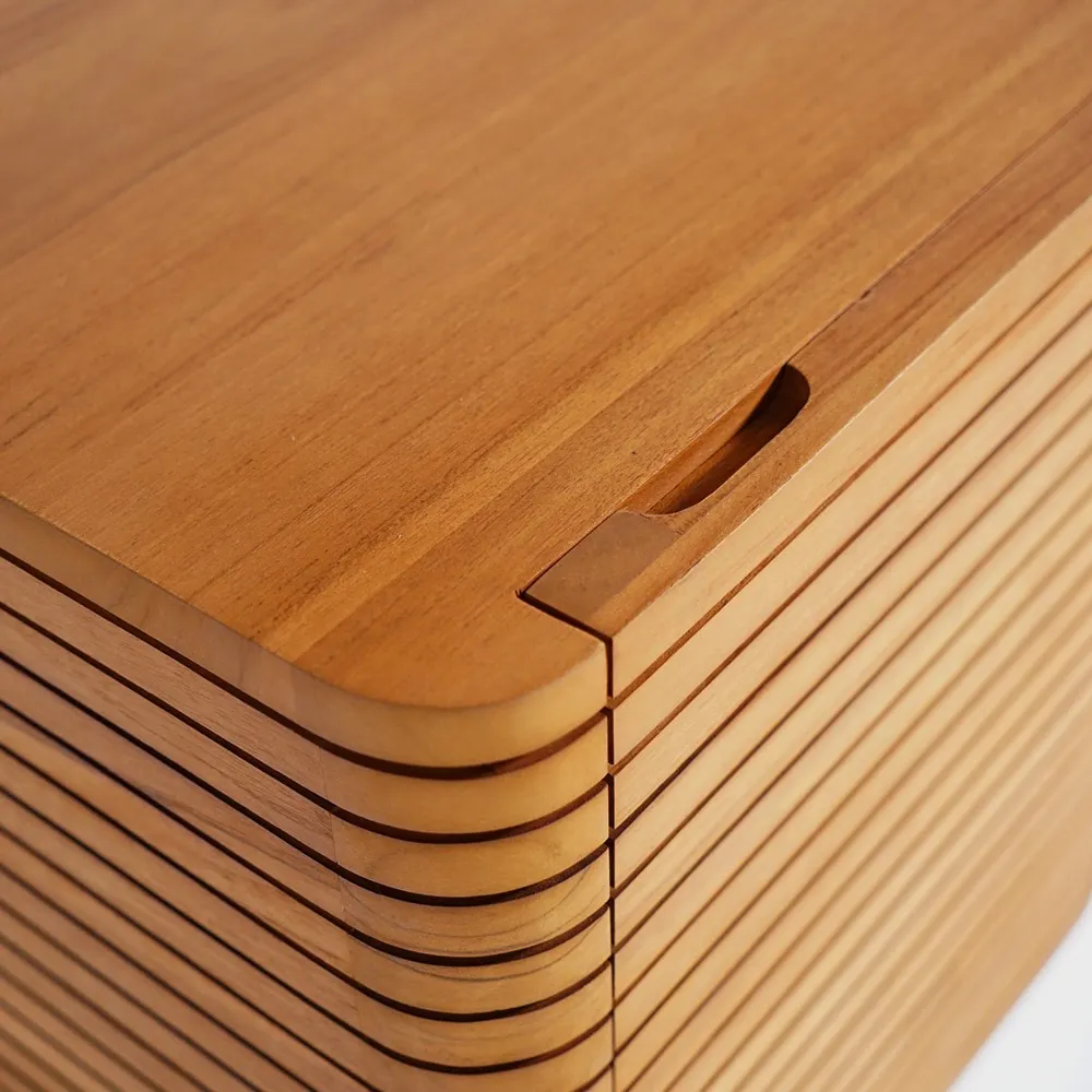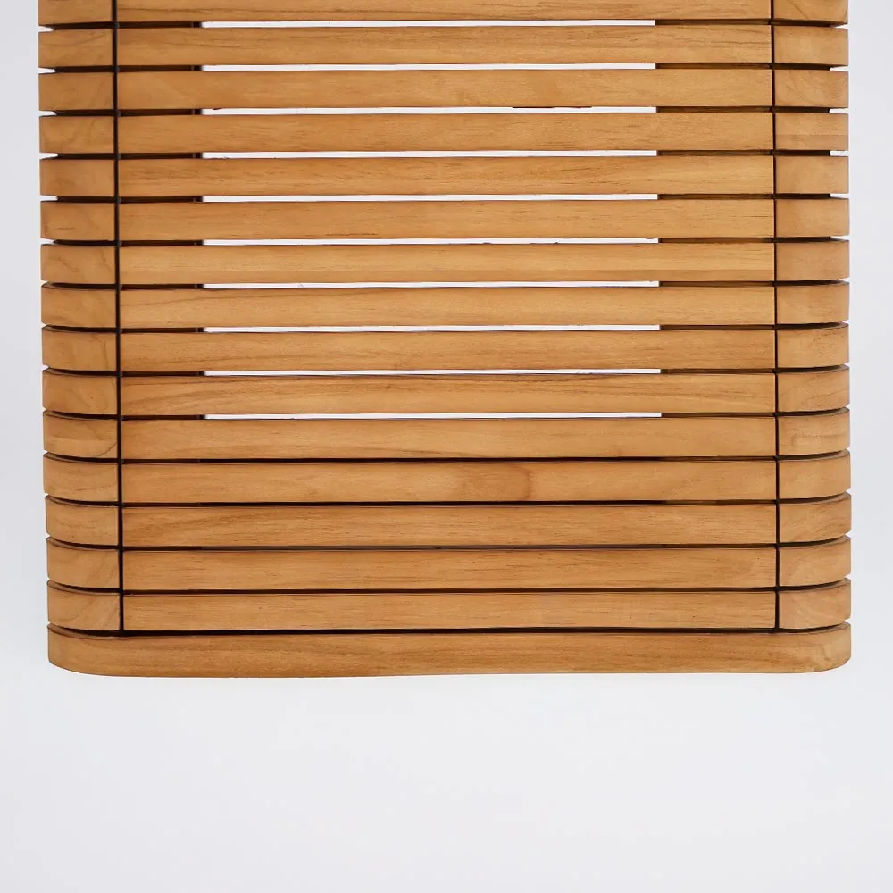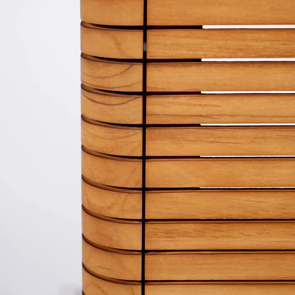 Het massief teak, gekozen om zijn robuustheid en natuurlijke weerstand tegen vocht, toont een fijne nerf en gouden nuances die met de tijd mooi patineren. We zijn bijzonder trots op het werk van de afgeronde latten, zorgvuldig uitgelijnd, die een subtiel schaduwspel creëren en het ambachtelijke karakter van de Lattis-collectie versterken. De verzachte hoeken en de perfecte afwerking getuigen van de aandacht voor elk detail.