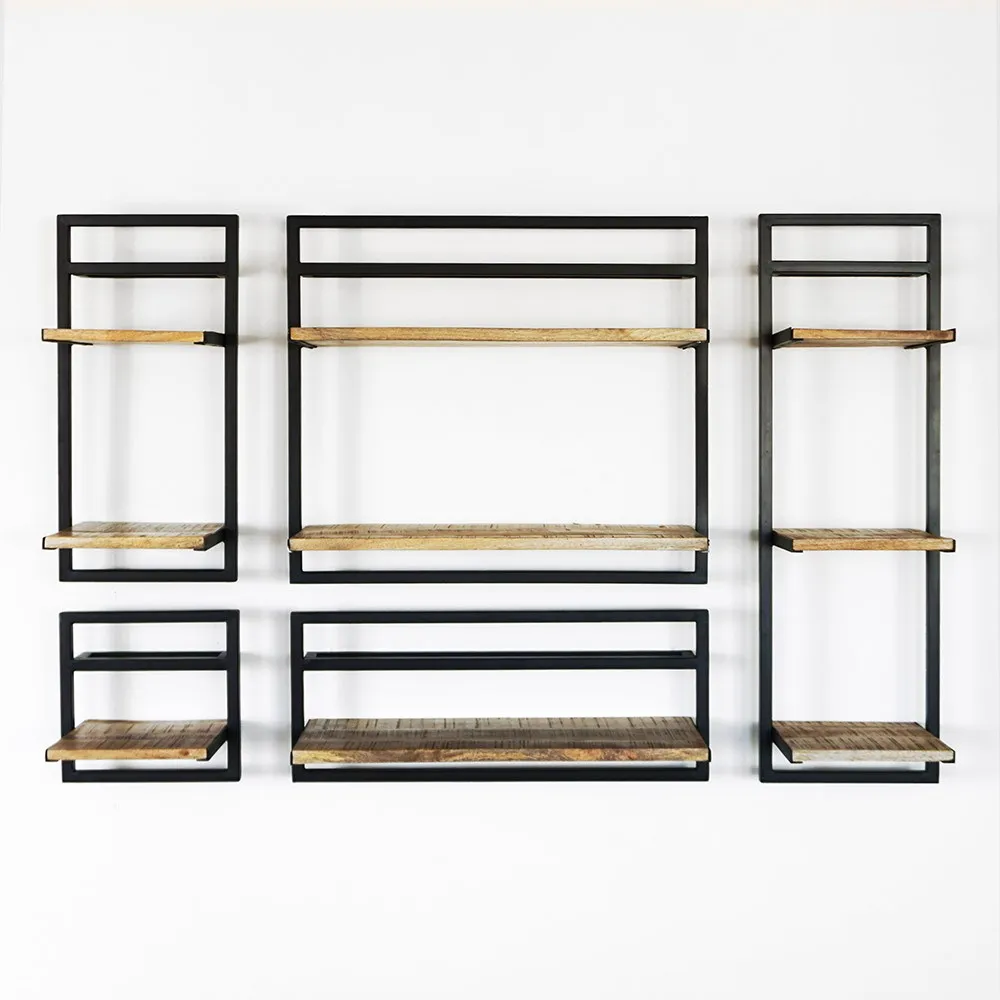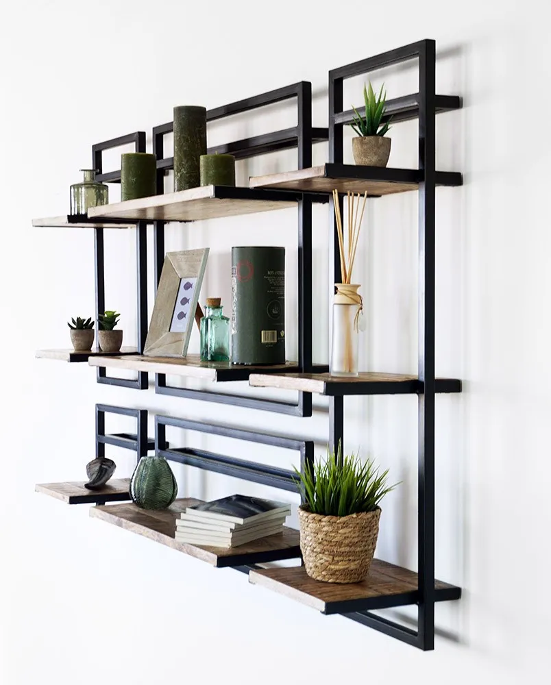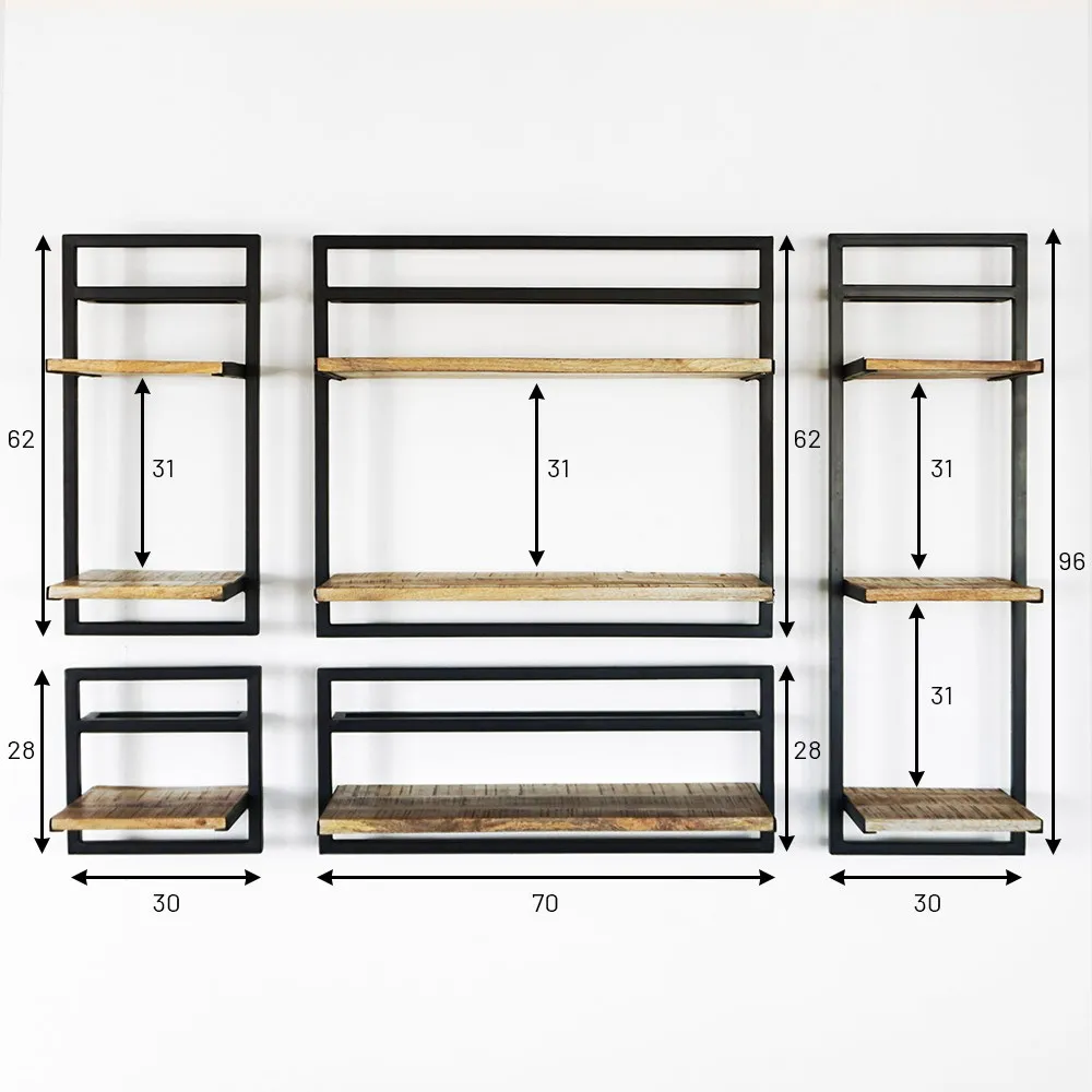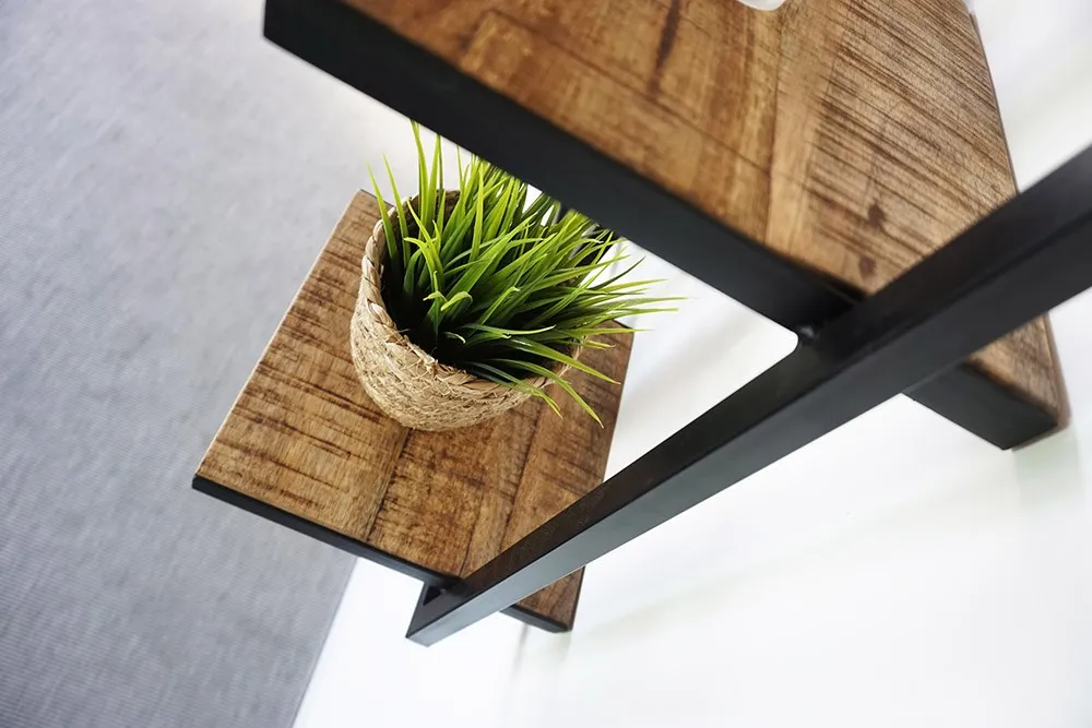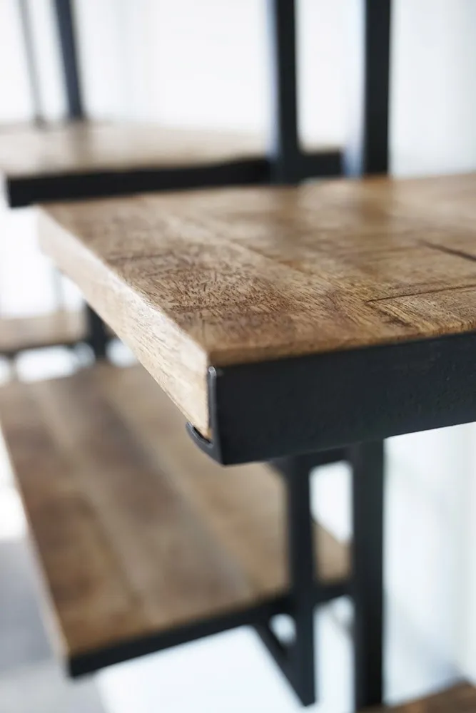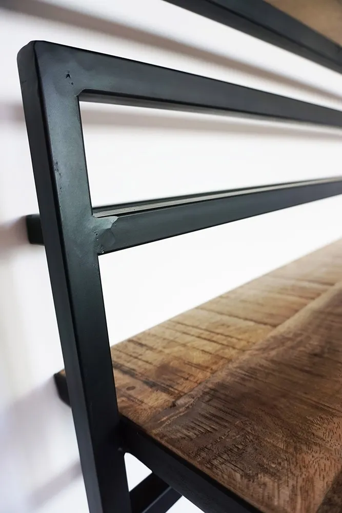 De massief houten planken zijn gemonteerd op een mooi metalen frame. Het lineaire aspect van dit geheel versterkt de industriële look en brengt lichtheid in het geheel. Het frame is gemaakt van zwart metaal en is voorzien van muurbeugels zodat de planken gemakkelijk kunnen worden opgehangen. Schroeven en pluggen zijn niet inbegrepen.