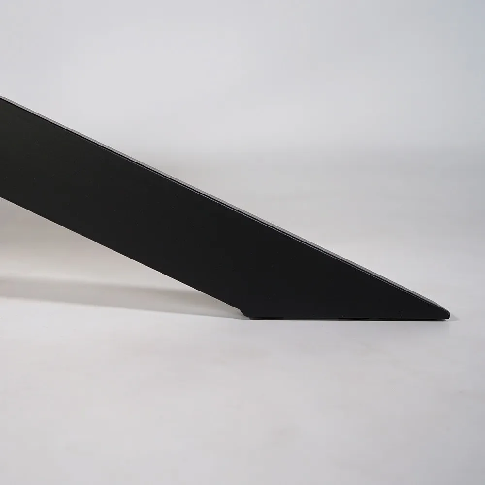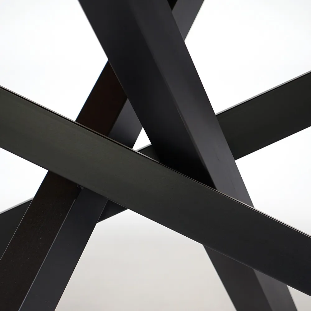 Het onderstel in zwart metaal vormt het kenmerkende element van այս creatie. Geïnspireerd op het spel mikado, bestaat het uit verschillende metalen stangen die nauwkeurig in elkaar grijpen en samen een stabiele en expressieve structuur vormen. Het ontwerp van deze vervlechting vroeg om echt studiewerk en technische uitwerking om tegelijk stevigheid, evenwicht en visuele lichtheid te garanderen. Dit contrast tussen de warmte van het hout en de strakke uitstraling van metaal creëert een krachtige vorm die zowel in een hedendaags interieur als in een meer industriële sfeer tot zijn recht komt.