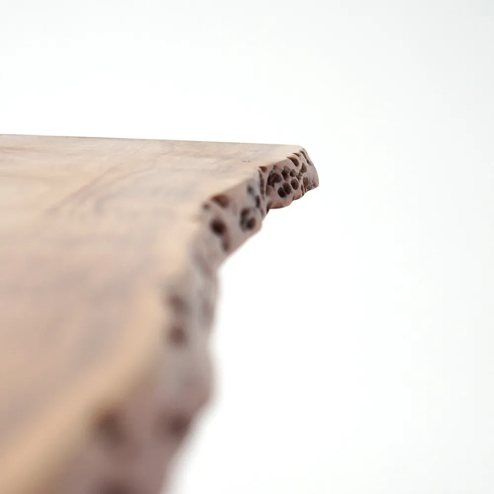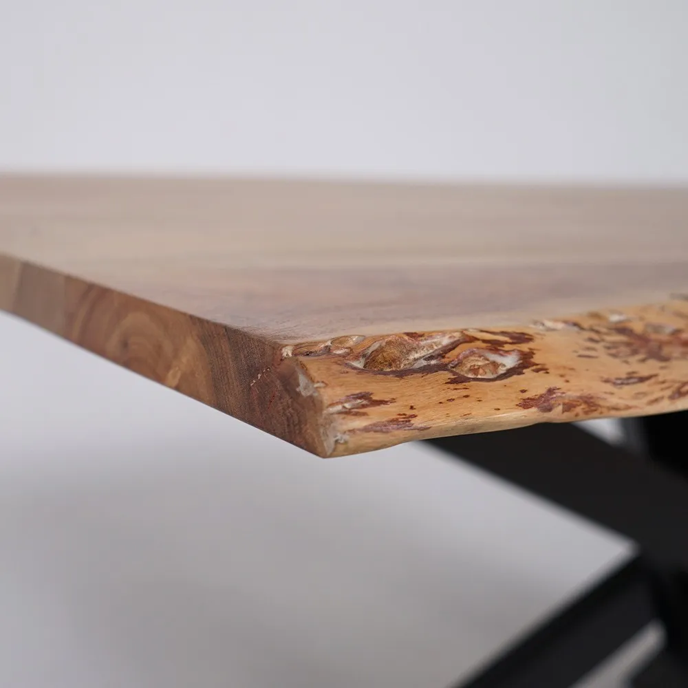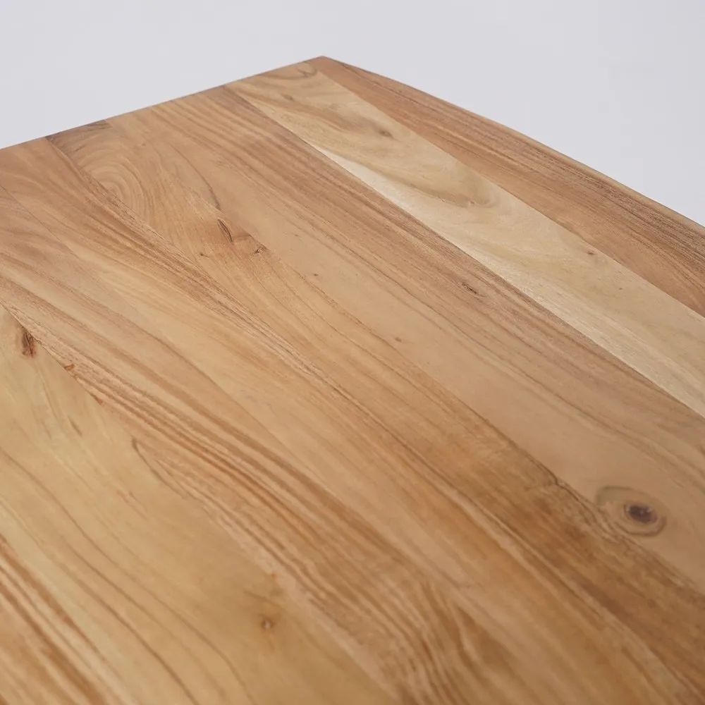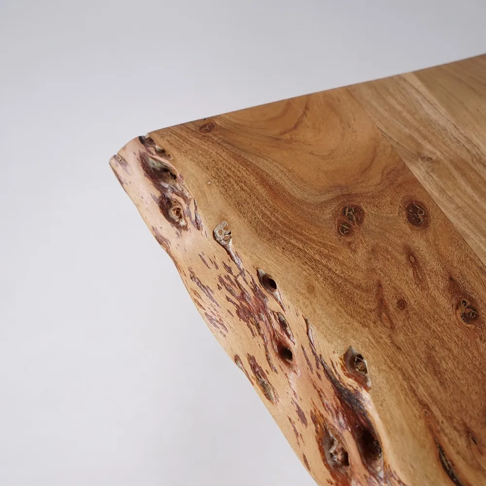 Het blad, vervaardigd uit massief acaciahout, onthult meteen het levendige karakter van deze houtsoort. Elke plank laat haar natuurlijke nuances, warme nerven en kleurverschillen zien, die het oppervlak een unieke diepte geven. Wij hebben ervoor gekozen om over de volledige lengte van het blad natuurlijke randen te behouden, zodat de oorspronkelijke uitstraling van het hout bewaard blijft. Deze onregelmatige lijnen herinneren aan de vorm van de boom waaruit het hout afkomstig is en geven het geheel een authentieke uitstraling.