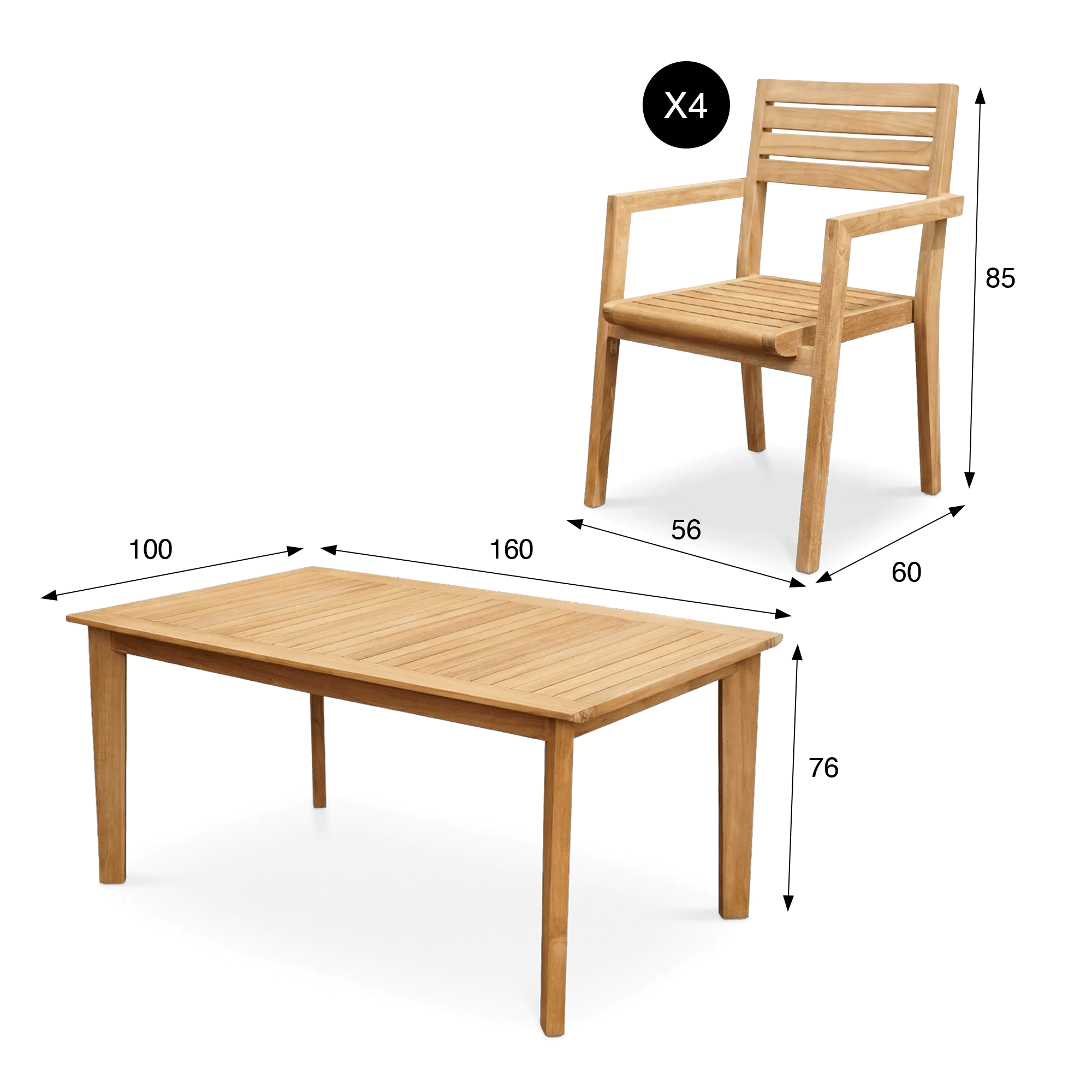 Wij hebben bijzondere aandacht besteed aan de afwerking om de zachte touch van het teak en de precisie van de verbindingen naar voren te brengen, als getuigenis van het ambachtelijke vakmanschap dat elk van onze creaties stuurt. Deze tuinset met tafel en stoelen belichaamt een visie op design waarin duurzaamheid en elegantie zich met soberheid uitdrukken, in een natuurlijke stijl die zowel in een hedendaagse omgeving als in een meer traditionele buitenruimte tot zijn recht komt.