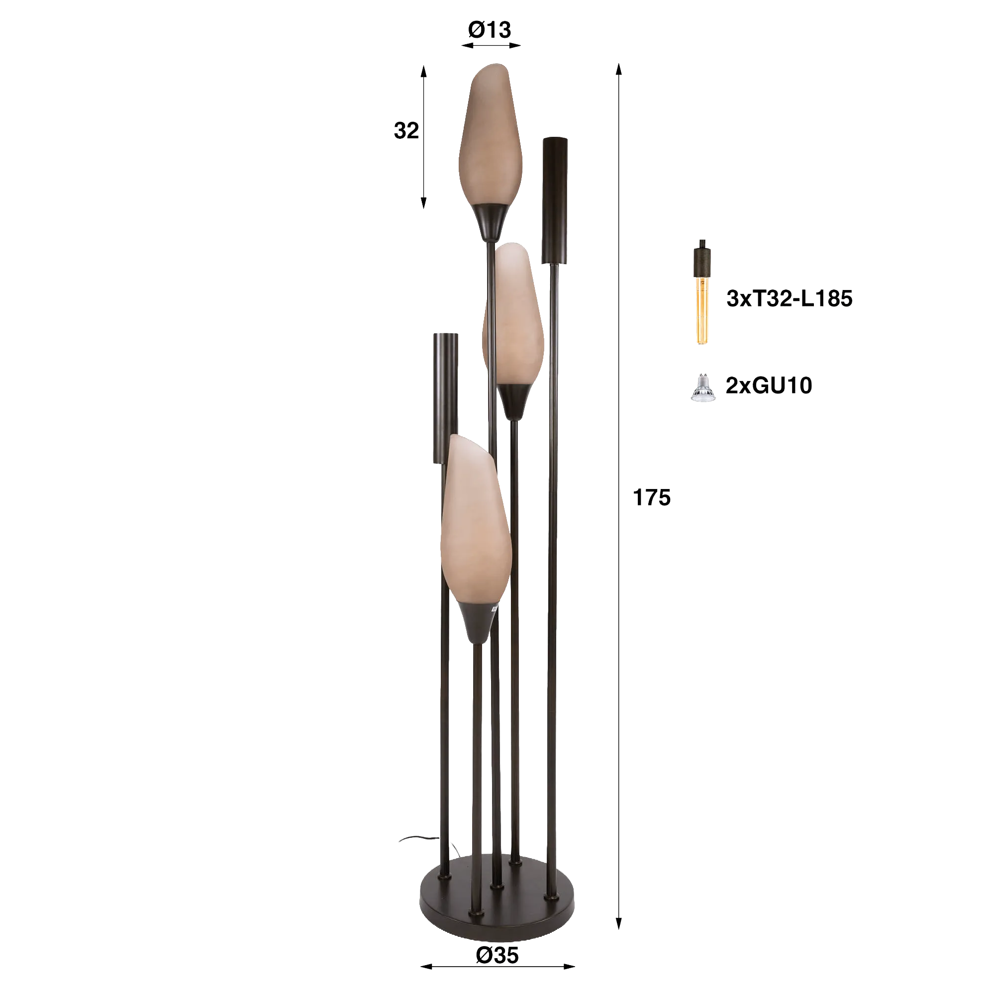 Bij het ontwerp van deze design vloerlamp in bruin metaal met lampenkappen van opaalglas kozen we voor bruin metaal omwille van zijn subtiele diepte en licht getextureerde gevoel, dat het licht opvangt zonder het overmatig te weerkaatsen. Deze afwerking benadrukt de zachtheid van het mondgeblazen opaalglas, waarvan het satijnen oppervlak de verlichting genuanceerd en gelijkmatig filtert. Elke lampenkap (lichtbronnen [T32-L185] en dimbare spots niet inbegrepen) van deze design vloerlamp in bruin metaal, ongeveer 32 cm hoog met een diameter van 13 cm, verspreidt een omhullende helderheid die verblinding voorkomt en een rustgevende sfeer bevordert. De ronde voet van 35 cm zorgt voor betrouwbare stabiliteit en versterkt tegelijk het evenwicht van de verhoudingen.