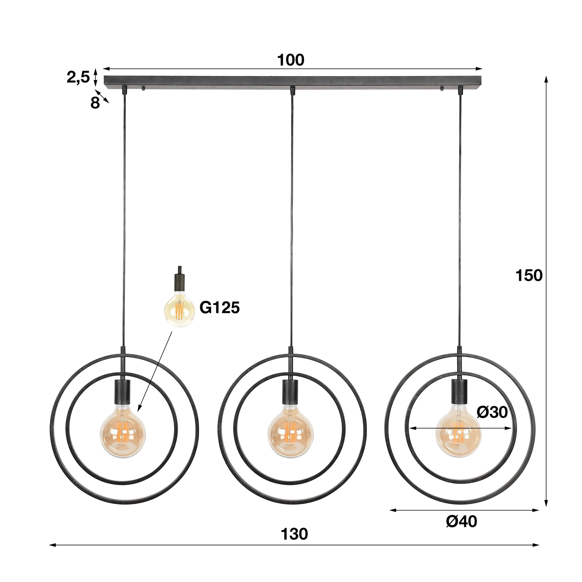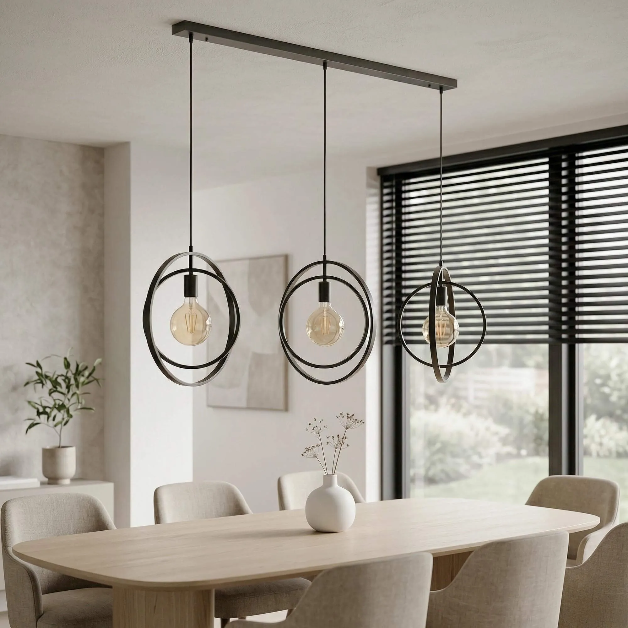 De horizontale structuur van 130 cm zorgt voor een evenwichtige aanwezigheid boven een eettafel, terwijl de verstelbare hoogte tot 150 cm het mogelijk maakt om de installatie aan de ruimte aan te passen. Elke ronde module van deze industriële hanglamp in zwart metaal, met een diameter van ongeveer 40 cm, omringt op subtiele wijze een G125-lamp (niet inbegrepen), waardoor de zuiverheid van het licht en de finesse van het metalen ontwerp extra tot hun recht komen. Het contrast tussen de matzwarte lijnen en de warmte van de verlichting creëert een uitnodigende sfeer, ideaal voor gedeelde momenten rond een maaltijd.