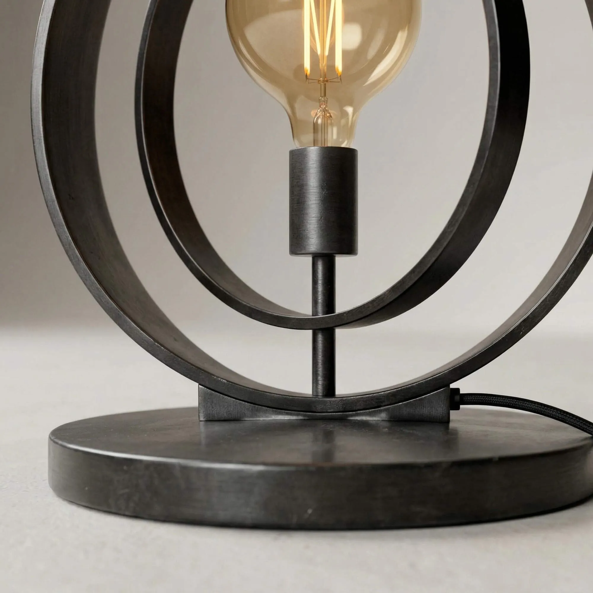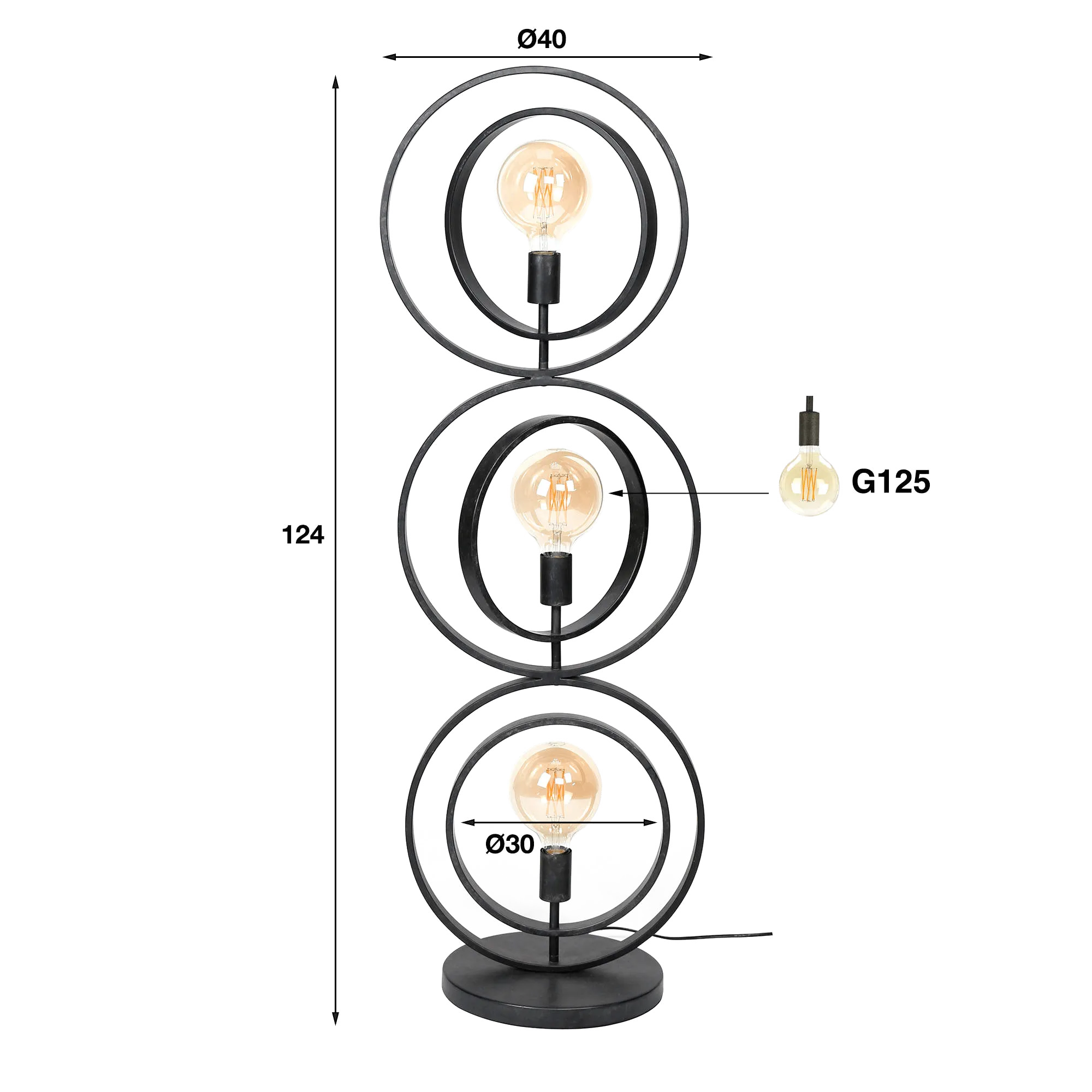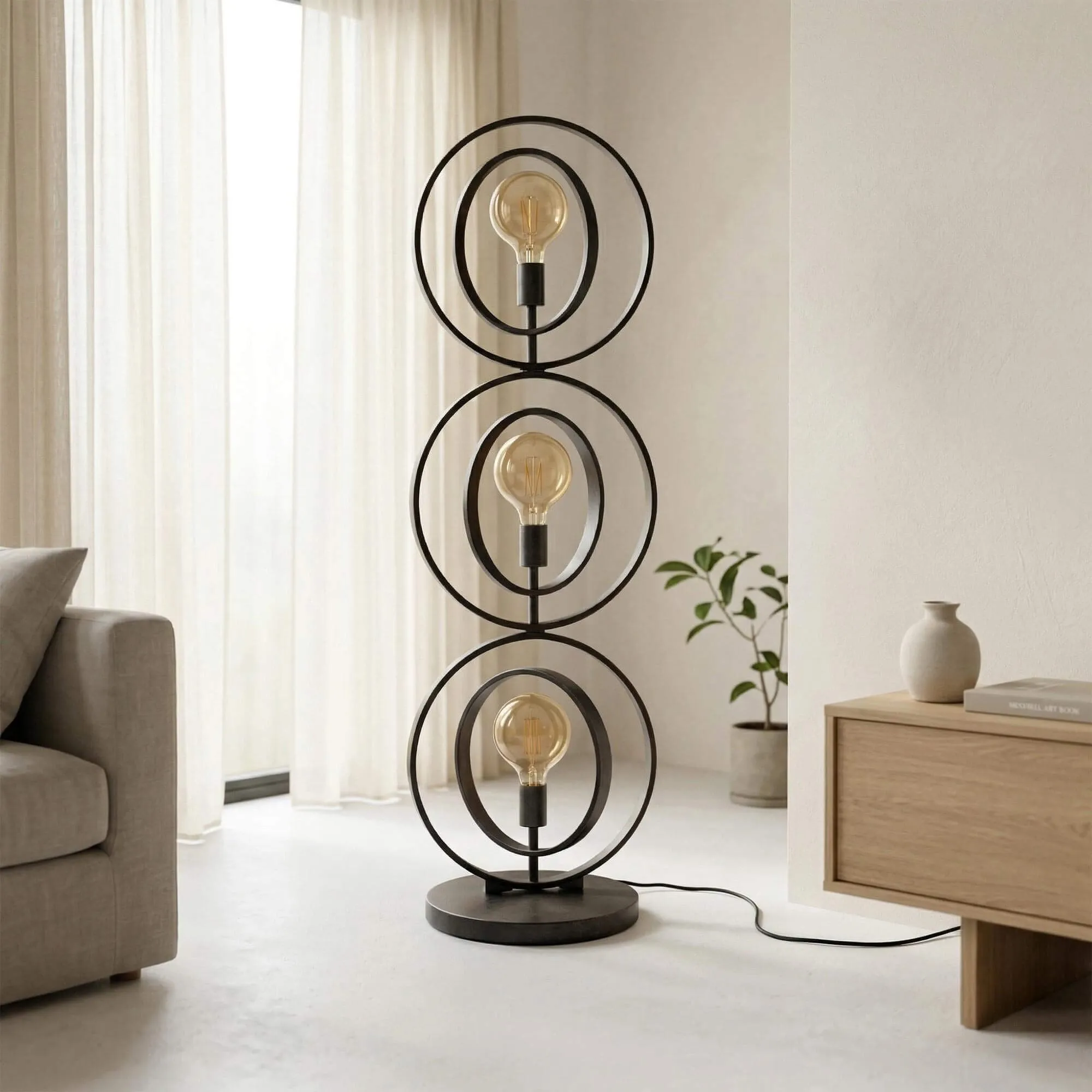 Het metaal waaruit de industriële vloerlamp voor de woonkamer Altis is vervaardigd, gekozen om zijn stevigheid en verfijnde uitstraling, krijgt een zorgvuldige afwerking die verkrijgbaar is in zwart of beige. Elk detail werd ontworpen om de zuiverheid van de lijnen te benadrukken, van de ronde voet die voor perfecte stabiliteit zorgt tot de verstelbare ringen waarmee de oriëntatie van de vormen subtiel kan worden aangepast. De drie G125-lichtbronnen (niet inbegrepen), benadrukt door een diameter van ongeveer 30 cm voor de centrale cirkels, verspreiden een warm licht dat de nuances van het metaal accentueert en een omhullende sfeer creëert.