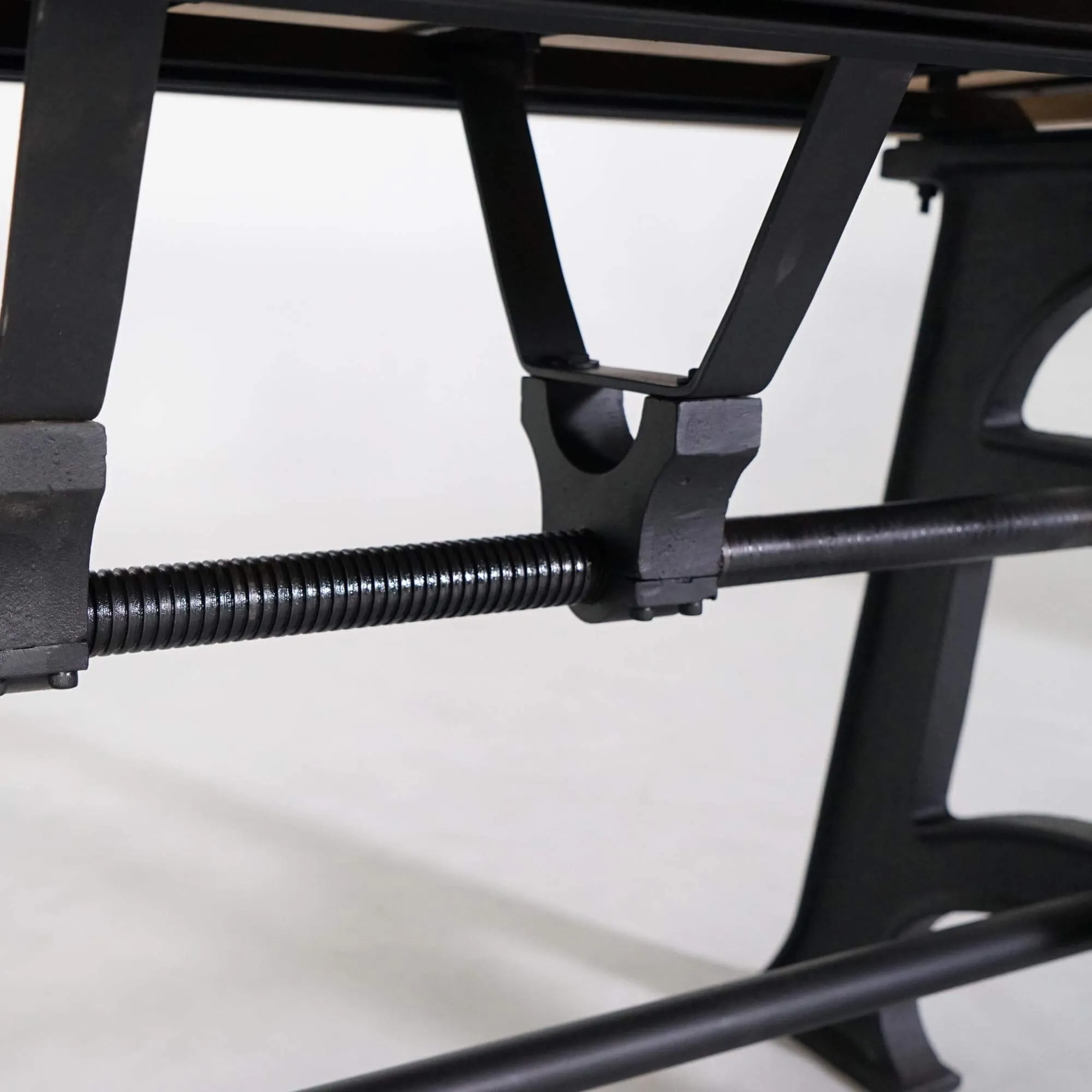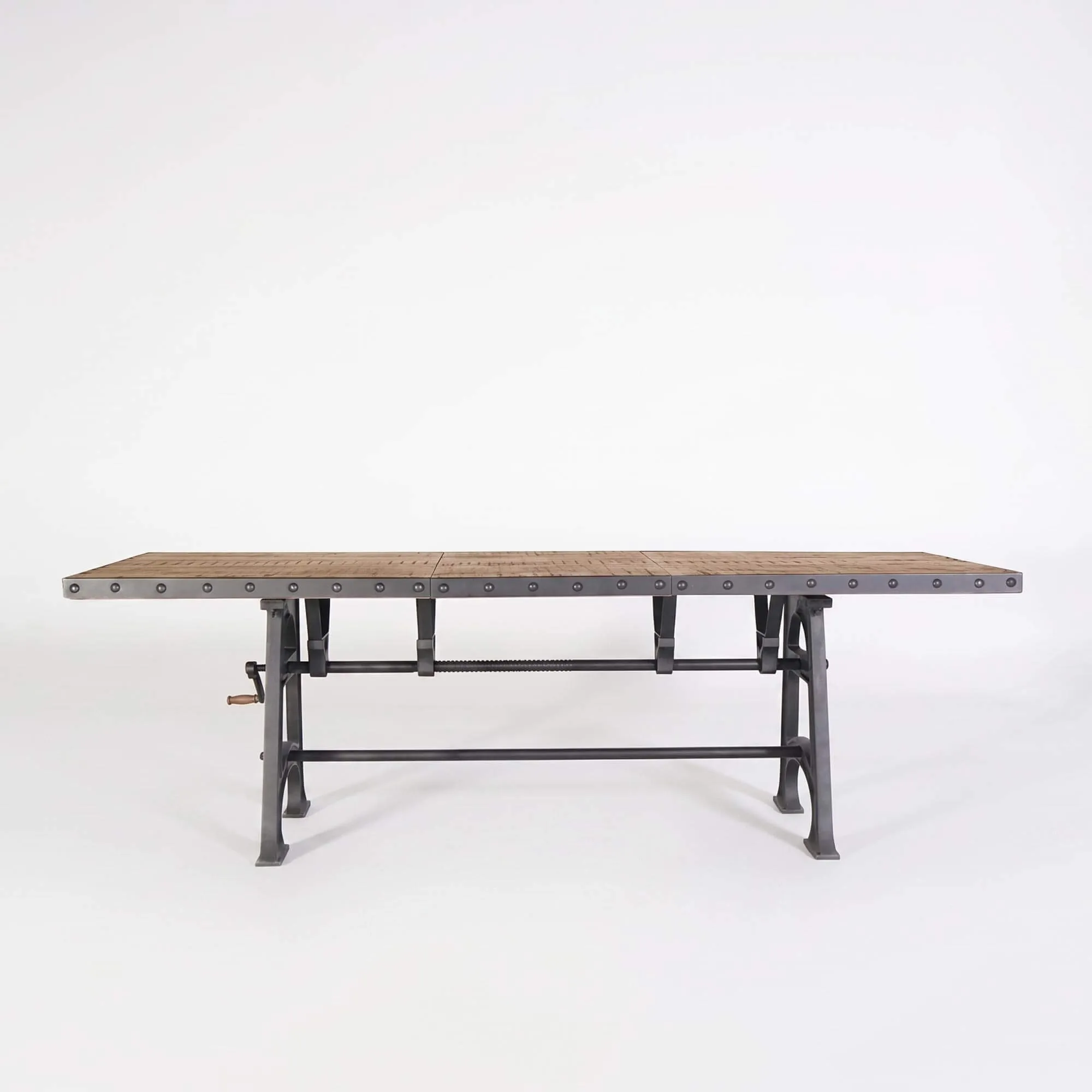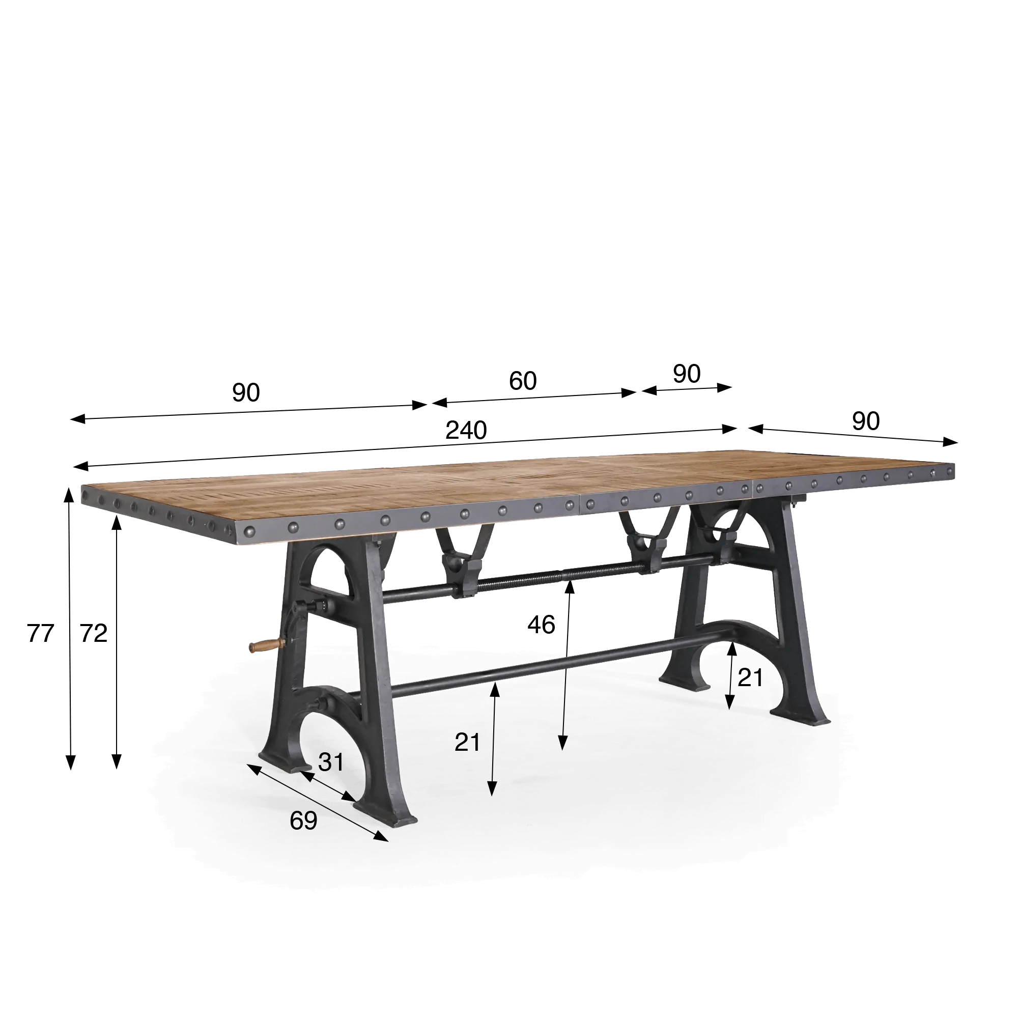 Mooie industriële uitschuifbare eettafel. De slinger aan de zijkant schuift de twee gelakte en behandelde mangohouten bladen naar de uitbouw. Lengte (180cm of 240cm met het verlengstuk). Zoals altijd bij B.A.R.A.K.'7 is de structuur zeer bestendig en is het bovenblad gemaakt van massief mangohout (gewicht: 178kg). Deze uitschuifbare industriële tafel is zeker een favoriet! De poot is gemaakt van massief gietijzer. Het oneindige schroefsysteem is geïnspireerd op werkplaats- en fabrieksmeubilair. Indien u de tabel gebruikt zonder de uitbreiding, moet de uitbreiding apart worden opgeslagen. Onze klanten zijn unaniem: deze tafel wordt het pronkstuk van uw industriële eetkamer.